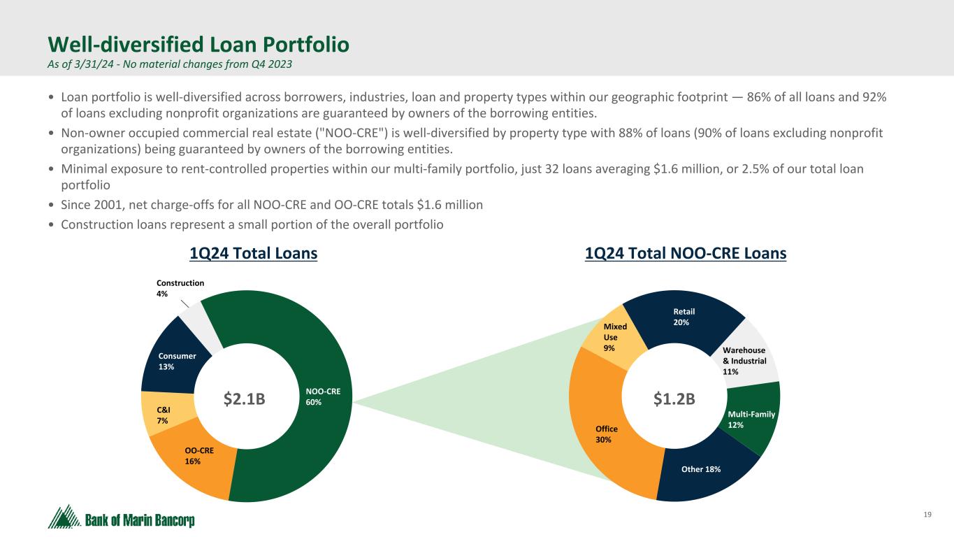 24 Text 95,96,96 Light Gray 232, 232, 232 Black 0, 0, 0 White 255, 255, 255 Accent 1 7,89,52 Accent 2 248,153,40 Accent 3 254,217,129 Accent 4 52,153,70 Accent 5 5,39,67 Accent 6 171,184,195 ($ in millions at Fair Value) * Loan-to-value largely based on appraised values at origination, or updated appraisals for certain high dollar or classified loans and, balances as of 3/31/24 Construction Portfolio Concentrations As of 3/31/24 Construction by Type 1Q24 Construction by County 1Q24 Multi-Family 68% 1-4 Residential 31% Land & Ag. 1% San Francisco 62% Alameda 27% Other Bay Area 3% Marin 7% Sonoma 1% Average Balance: $5.5MM Largest Loan: $19.4MM Wtd. Ave. LTV*: 72% Total Balance: $71.5MM Unfunded Commitments: $10.2MM Total Loans: 13 $71MM $71MM • Construction loans decreased by $27.2 million since 4Q23 from project completions • Most payoffs were in counties other than San Francisco, increasing the allocation to 62% from 44%, but no additional dollar exposure in San Francisco