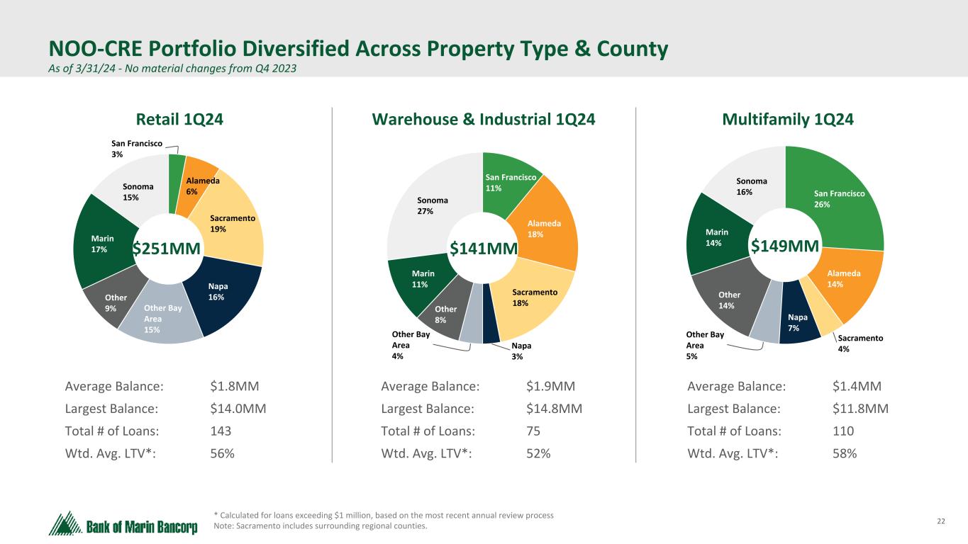 21 Text 95,96,96 Light Gray 232, 232, 232 Black 0, 0, 0 White 255, 255, 255 Accent 1 7,89,52 Accent 2 248,153,40 Accent 3 254,217,129 Accent 4 52,153,70 Accent 5 5,39,67 Accent 6 171,184,195 • $367 million in credit exposure spread across our lending footprint comprised of 151 loans • $2.4 million average loan balance – largest loan at $16.8 million • 60% weighted average loan-to-value and 1.58x weighted average debt-service coverage ratio* • City of San Francisco NOO-CRE office exposure is 3% of total loan portfolio and 6% of total NOO-CRE loans NOO-CRE Office Portfolio by County * Calculated for loans exceeding $1 million, based on the most recent annual review process Non-owner Occupied Office Exposure As of 3/31/24 - No material changes from Q4 2023 San Francisco 19% Alameda 6% Sacramento 7% Napa 10% Other Bay Area 13% Other 4% Marin 24% Sonoma 17% $367MM City of S.F. NOO-CRE Office Portfolio Total Balance: $70.5 million Average Loan Bal: $5.4 million Number of Loans: 13 loans Wtd. Ave. LTV*: 70% Wtd. Ave. DCR: 0.99x Average Occupancy: 78% 12 of the 13 loans are secured by low rise buildings and one loan is secured by a 10 story building.