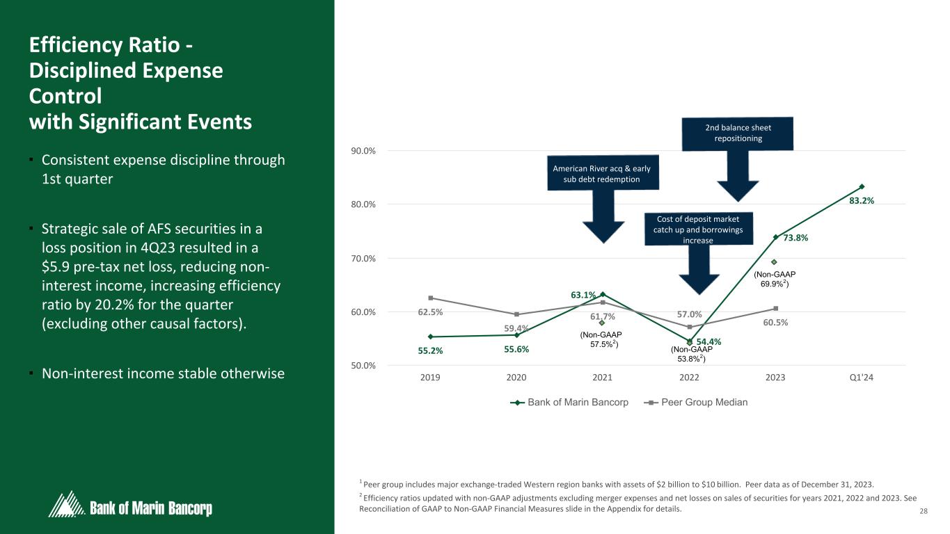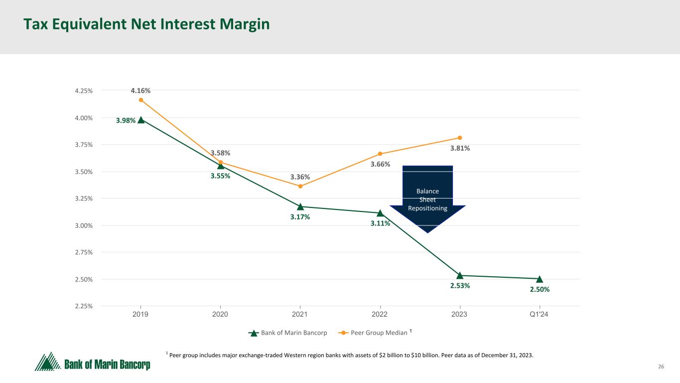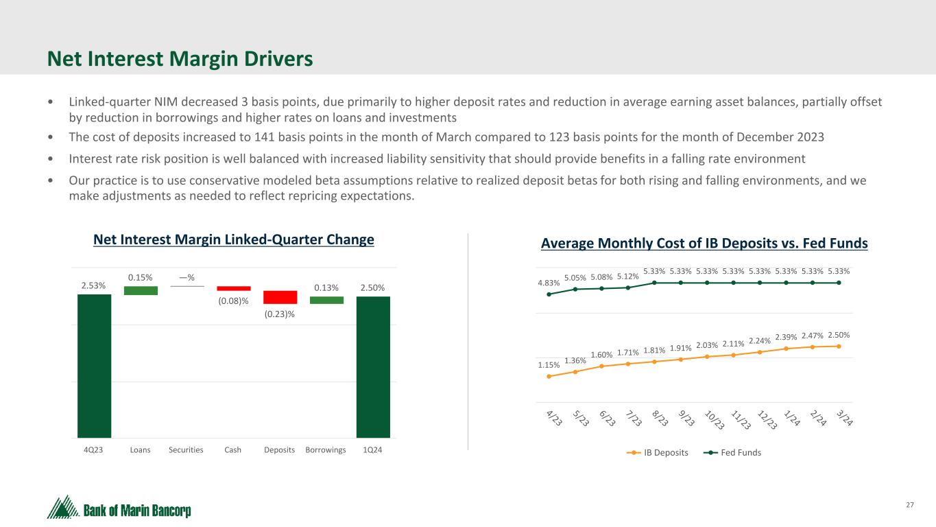 26 Text 95,96,96 Light Gray 232, 232, 232 Black 0, 0, 0 White 255, 255, 255 Accent 1 7,89,52 Accent 2 248,153,40 Accent 3 254,217,129 Accent 4 52,153,70 Accent 5 5,39,67 Accent 6 171,184,195 Tax Equivalent Net Interest Margin 1 Peer group includes major exchange-traded Western region banks with assets of $2 billion to $10 billion. Peer data as of December 31, 2023. Balance Sheet Repositioning 3.98% 3.55% 3.17% 3.11% 2.53% 2.50% 4.16% 3.58% 3.36% 3.66% 3.81% Bank of Marin Bancorp Peer Group Median 2019 2020 2021 2022 2023 Q1'24 2.25% 2.50% 2.75% 3.00% 3.25% 3.50% 3.75% 4.00% 4.25% 1