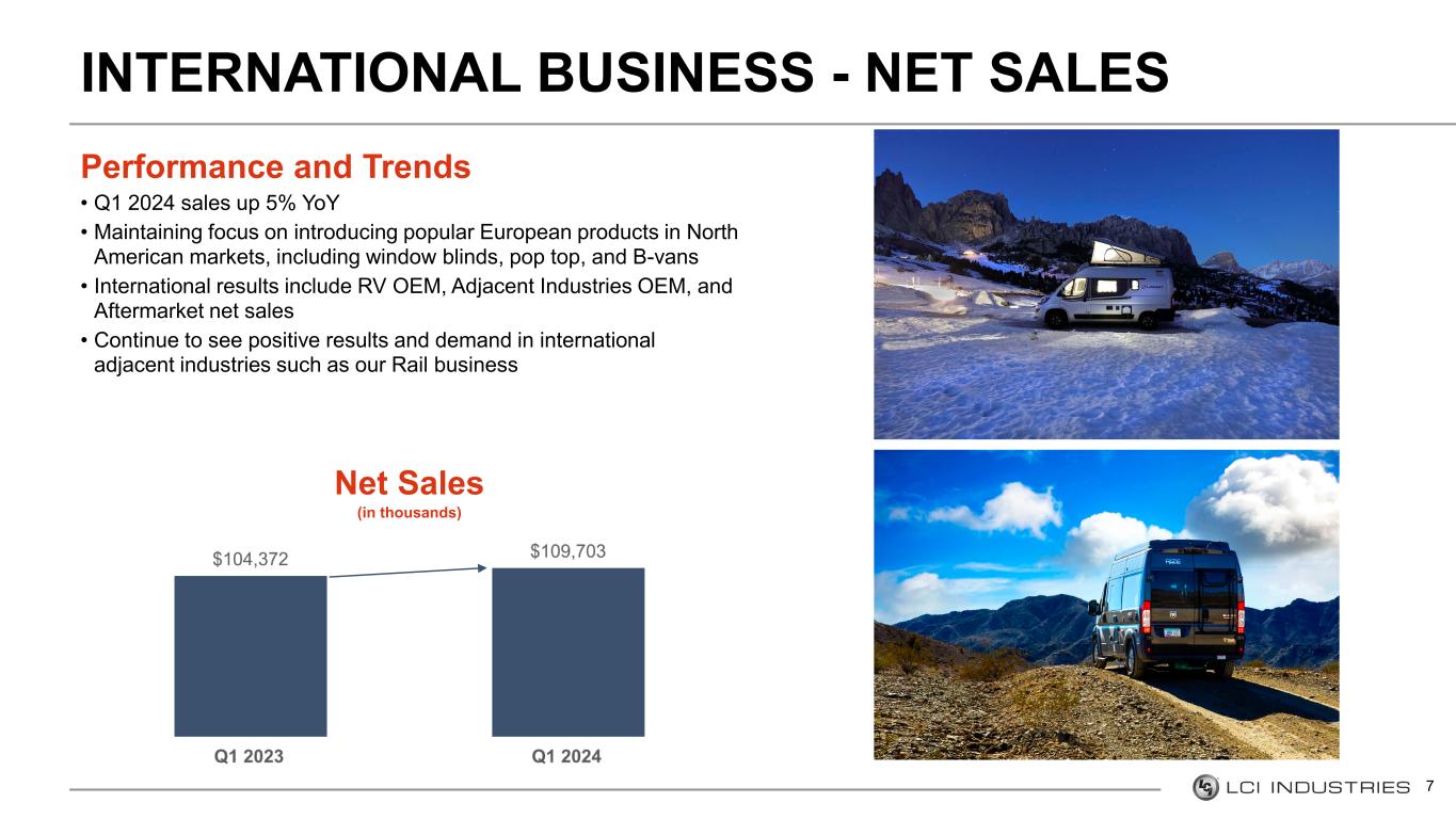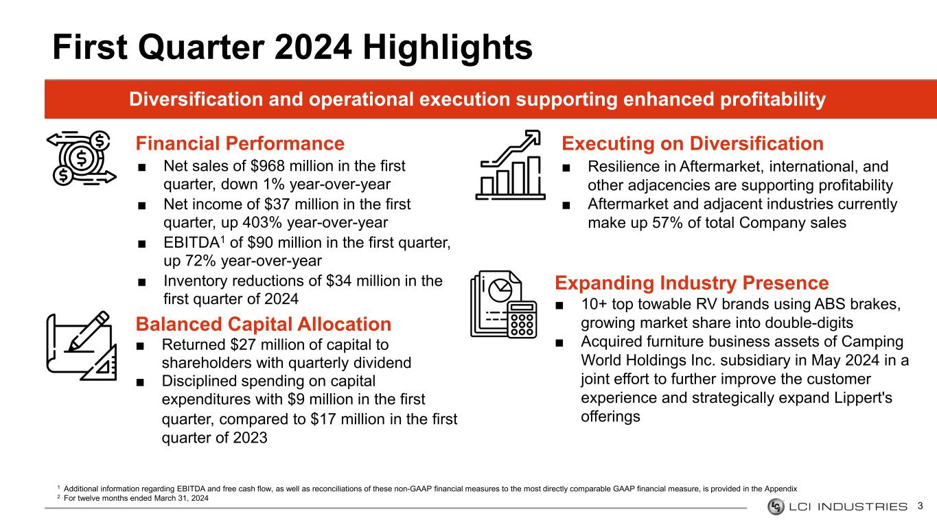 "We delivered solid results in the first quarter, starting the year with healthy EBITDA generation and margin expansion supported by our strong operational focus and improved material costs. As we continue to diversify our business, strength in some of our growing markets like automotive aftermarket, housing, and our transportation businesses has consistently lifted profitability while adding a layer of durable, countercyclical revenue streams. We believe that our diversified markets will remain important drivers of Lippert’s profitable growth into the future,” commented Jason Lippert, LCI Industries’ President and Chief Executive Officer. “We are seeing signs of recovery in North American RV and expect a gradual improvement in production heading further into the year, led by towables where we typically provide the majority of our innovative RV content. Further, introductions of advanced products like our transformational ABS system are embedding us even deeper with key OEMs across our markets, creating opportunities for long-term content growth and serving as the catalyst for approximately $200 million in new business commitments for 2024.”