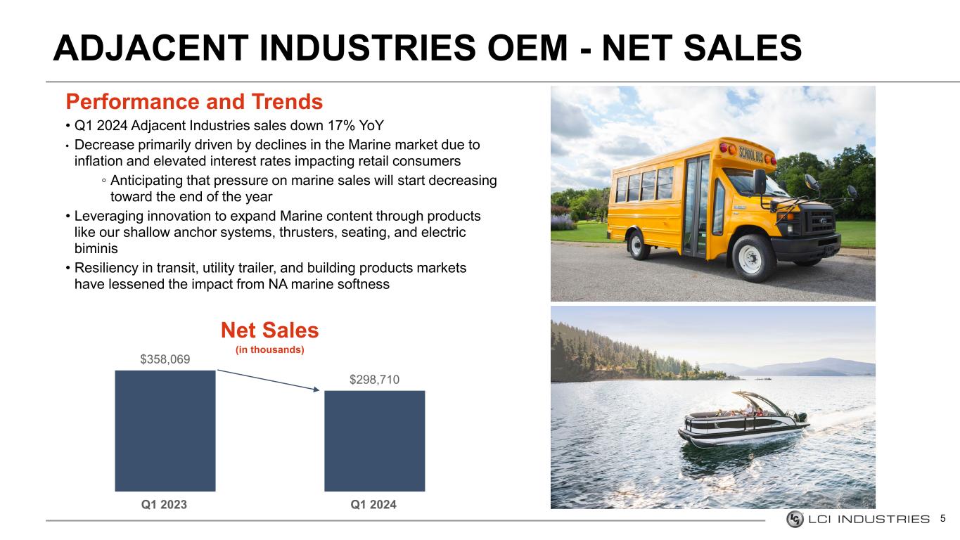 Performance and Trends • 73,500 wholesale towable units shipped in Q1 2024, up 17% YOY • Q1 2024 RV OEM sales up 15% YoY • Current 2024 North American forecast of 325 - 350k wholesale units • April 2024 net sales up 12% over April 2023, reflecting gradual industry recovery RV OEM - NET SALES Content per Wholesale Unit • Travel trailer and fifth-wheel RV content of $5,097 for Q1 20241, up 1% sequentially over Q4 2023 • Motorhome content of $3,656 for Q1 20241, up 4% sequentially over Q4 2023 4 Net Sales (in thousands) 1 For twelve months ended March 31, 2024