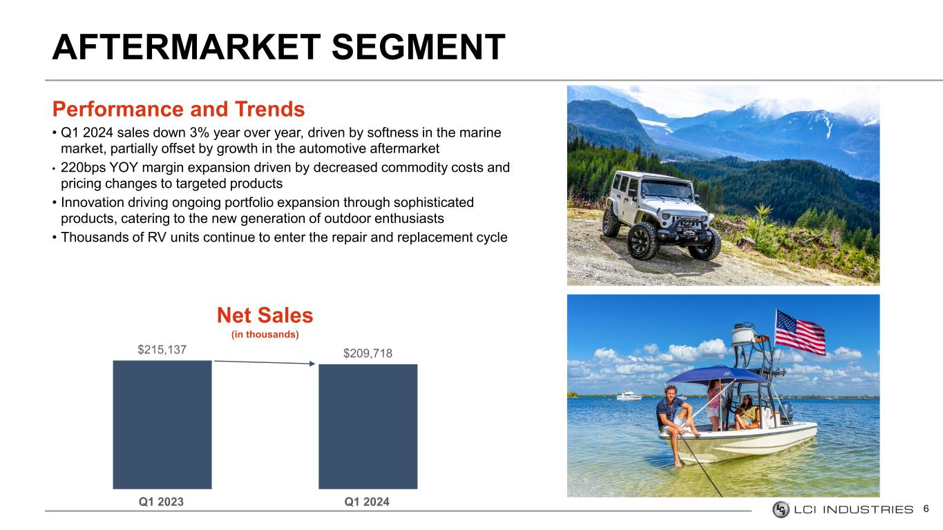 “We achieved another quarter of strong profitability in Aftermarket, expanding operating margins by over 200 basis points. Robust demand from the automotive aftermarket, in addition to the growing need for repair, replacement, and upgrades in RV and other adjacencies we serve, are providing a strong tailwind for the business,” Jamie Schnur, LCI Industries’ Group President – Aftermarket commented. “As Jason mentioned, Aftermarket is consistently