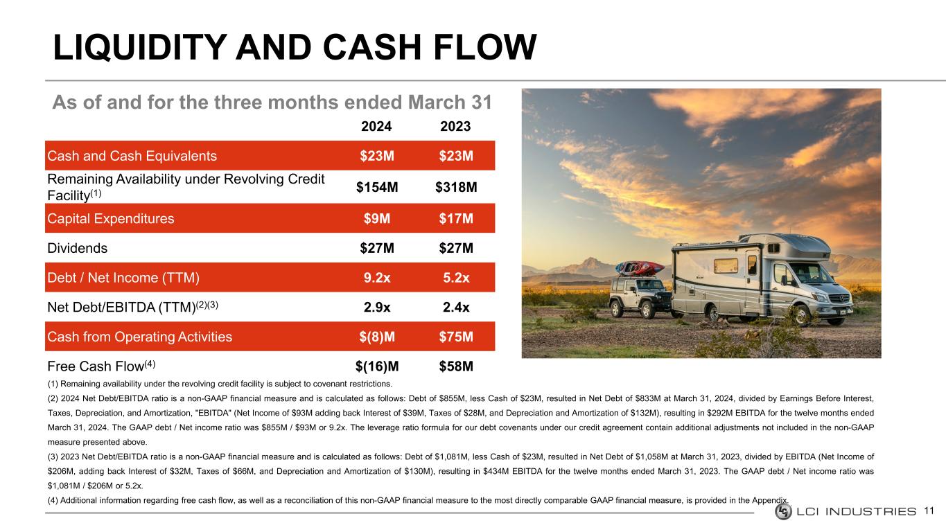 "We are committed to making continued operational improvements across our footprint, with a focus on creating flexible capacity while reducing costs. We continue to reduce inventory and focus on cash generation as we progress through the year. With our fortified balance sheet, we will continue investing in R&D and innovation while pursuing strategic growth opportunities and returning capital to shareholders,” continued Mr. Lippert. “Looking ahead, we are well-positioned to capture market share gains and advance our competitive position throughout 2024."