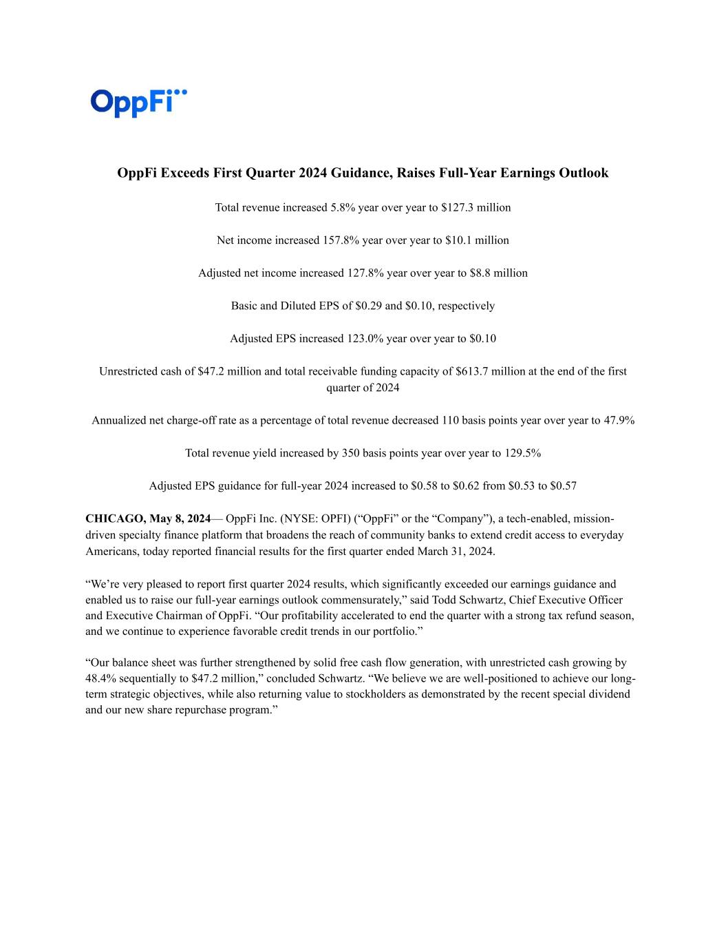 1 Disclaimer This presentation (the “Presentation”) of OppFi Inc. (“OppFi” or the “Company”) is for information purposes only. Certain information contained herein has been derived from sources prepared by third parties. While such information is believed to be reliable for the purposes used herein, the Company makes no representation or warranty with respect to the accuracy of such information. Trademarks and trade names referred to in this Presentation are the property of their respective owners. The information contained herein does not purport to be all-inclusive. This Presentation does not constitute investment, tax, or legal advice. No representation or warranty, express or implied, is or will be given by the Company or any of its respective affiliates, directors, officers, employees or advisers or any other person as to the accuracy or completeness of the information in this Presentation, and no responsibility or liability whatsoever is accepted for the accuracy or sufficiency thereof or for any errors, omissions or misstatements, negligent or otherwise, relating thereto. The information contained in this Presentation is preliminary in nature and is subject to change, and any such changes may be material. The Company disclaims any duty to update the information contained in this Presentation, which information is given only as of the date of this Presentation unless otherwise stated herein. Forward-Looking Statements This Presentation includes “forward-looking statements” within the meaning of the “safe harbor” provisions of the Private Securities Litigation Reform Act of 1995, Section 27A of the Securities Act of 1933, as amended, and Section 21E of the Securities Exchange Act of 1934, as amended. OppFi’s actual results may differ from its expectations, estimates and projections and consequently, you should not rely on these forward-looking statements as predictions of future events. Words such as “expect,” “estimate,” “project,” “budget,” “forecast,” “anticipate,” “intend,” “plan,” “may,” “will,” “could,” “should,” “believes,” “predicts,” “potential,” “possible,” “continue,” and similar expressions may identify forward-looking statements, but the absence of these words does not mean that a statement is not forward-looking. These forward-looking statements include, without limitation, OppFi’s expectations with respect to its full year 2024 guidance, the future performance of OppFi’s platform, and expectations for OppFi’s growth, new products, and future financial performance. These forward-looking statements are based on OppFi’s current expectations and assumptions about future events and are based on currently available information as to the outcome and timing of future events. These forward-looking statements involve significant risks and uncertainties that could cause the actual results to differ materially from the expected results. Most of these factors are outside OppFi’s control and are difficult to predict. Factors that may cause such differences include, but are not limited to: the impact of general economic conditions, including economic slowdowns, inflation, interest rate changes, recessions, and tightening of credit markets on OppFi’s business; the impact of challenging macroeconomic and marketplace conditions, including lingering effects of COVID-19 on OppFi’s business; the impact of stimulus or other government programs; whether OppFi will be successful in obtaining declaratory relief against the Commissioner of the Department of Financial Protection and Innovation for the State of California; whether OppFi will be subject to AB 539; whether OppFi’s bank partners will continue to lend in California and whether OppFi’s financing sources will continue to finance the purchase of participation rights in loans originated by OppFi’s bank partners in California; the impact that events involving financial institutions or the financial services industry generally, such as actual concerns or events involving liquidity, defaults, or non-performance, may have on OppFi’s business; risks related to the material weakness in OppFi’s internal controls over financial reporting; the ability of OppFi to grow and manage growth profitably and retain its key employees; risks related to new products; risks related to evaluating and potentially consummating acquisitions; concentration risk; risks related to OppFi's ability to comply with various covenants in its corporate and warehouse credit facilities; costs related to the business combination; changes in applicable laws or regulations; the possibility that OppFi may be adversely affected by other economic, business, and/or competitive factors; risks related to management transitions; risks related to the restatement of OppFi’s financial statements and any accounting deficiencies or weaknesses related thereto; and other risks and uncertainties indicated from time to time in OppFi’s filings with the United States Securities and Exchange Commission, in particular, contained in the section or sections captioned “Risk Factors.” OppFi cautions that the foregoing list of factors is not exclusive, and readers should not place undue reliance upon any forward-looking statements, which speak only as of the date made. OppFi does not undertake or accept any obligation or undertaking to release publicly any updates or revisions to any forward-looking statements to reflect any change in its expectations or any change in events, conditions or circumstances on which any such statement is based. Non-GAAP Financial Measures Certain financial information and data contained in this Presentation are unaudited and do not conform to Regulation S-X. Accordingly, such information and data may not be included in, may be adjusted in or may be presented differently in, any periodic filing, information or proxy statement, or prospectus or registra