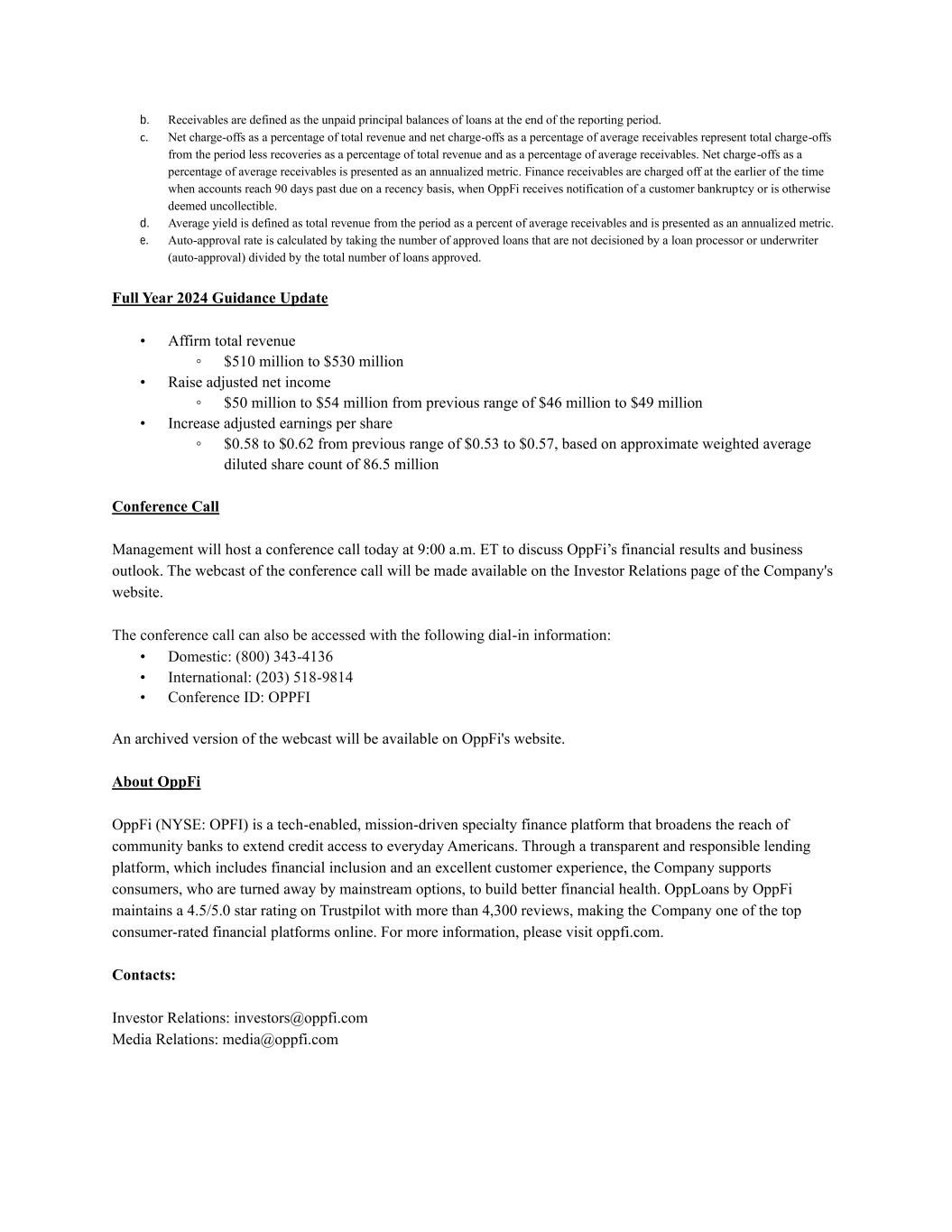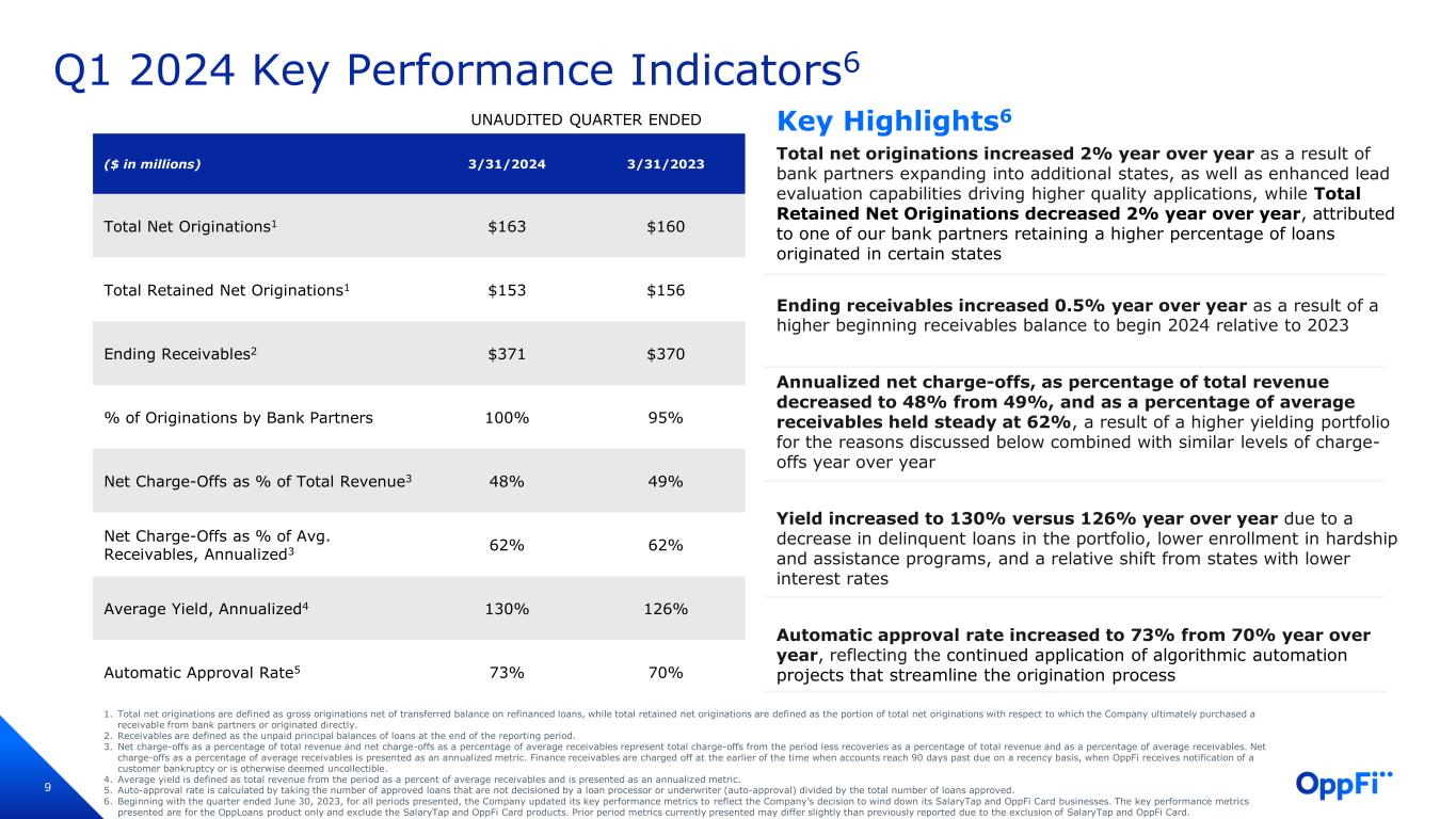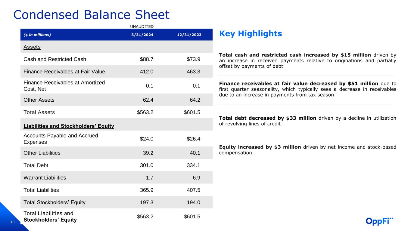 9 Total net originations increased 2% year over year as a result of bank partners expanding into additional states, as well as enhanced lead evaluation capabilities driving higher quality applications, while Total Retained Net Originations decreased 2% year over year, attributed to one of our bank partners retaining a higher percentage of loans originated in certain states Ending receivables increased 0.5% year over year as a result of a higher beginning receivables balance to begin 2024 relative to 2023 Annualized net charge-offs, as percentage of total revenue decreased to 48% from 49%, and as a percentage of average receivables held steady at 62%, a result of a higher yielding portfolio for the reasons discussed below combined with similar levels of charge- offs year over year Yield increased to 130% versus 126% year over year due to a decrease in delinquent loans in the portfolio, lower enrollment in hardship and assistance programs, and a relative shift from states with lower interest rates Automatic approval rate increased to 73% from 70% year over year, reflecting the continued application of algorithmic automation projects that streamline the origination process Q1 2024 Key Performance Indicators6 UNAUDITED QUARTER ENDED ($ in millions) 3/31/2024 3/31/2023 Total Net Originations1 $163 $160 Total Retained Net Originations1 $153 $156 Ending Receivables2 $371 $370 % of Originations by Bank Partners 100% 95% Net Charge-Offs as % of Total Revenue3 48% 49% Net Charge-Offs as % of Avg. Receivables, Annualized3 62% 62% Average Yield, Annualized4 130% 126% Automatic Approval Rate5 73% 70% 1. Total net originations are defined as gross originations net of transferred balance on refinanced loans, while total retained net originations are defined as the portion of total net originations with respect to which the Company ultimately purchased a receivable from bank partners or originated directly. 2. Receivables are defined as the unpaid principal balances of loans at the end of the reporting period. 3. Net charge-offs as a percentage of total revenue and net charge-offs as a percentage of average receivables represent total charge-offs from the period less recoveries as a percentage of total revenue and as a percentage of average receivables. Net charge-offs as a percentage of average receivables is presented as an annualized metric. Finance receivables are charged off at the earlier of the time when accounts reach 90 days past due on a recency basis, when OppFi receives notification of a customer bankruptcy or is otherwise deemed uncollectible. 4. Average yield is defined as total revenue from the period as a percent of average receivables and is presented as an annualized metric. 5. Auto-approval rate is calculated by taking the number of approved loans that are not decisioned by a loan processor or underwriter (auto-approval) divided by the total number of loans approved. 6. Beginning with the quarter ended June 30, 2023, for all periods presented, the Company updated its key performance metrics to reflect the Company’s decision to wind down its SalaryTap and OppFi Card businesses. The key performance metrics presented are for the OppLoans product only and exclude the SalaryTap and OppFi Card products. Prior period metrics currently presented may differ slightly than previously reported due to the exclusion of SalaryTap and OppFi Card. Key Highlights6