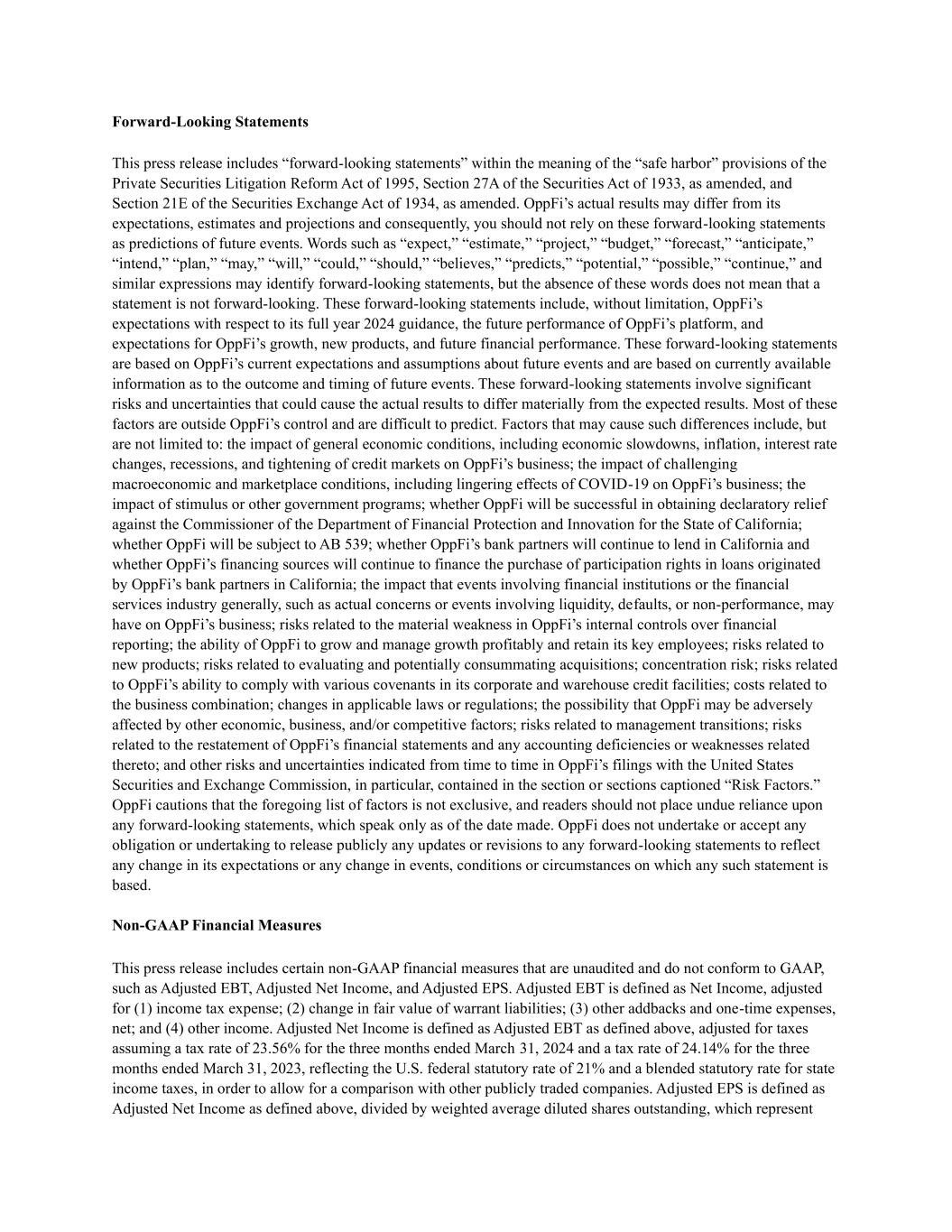 1 Disclaimer This presentation (the “Presentation”) of OppFi Inc. (“OppFi” or the “Company”) is for information purposes only. Certain information contained herein has been derived from sources prepared by third parties. While such information is believed to be reliable for the purposes used herein, the Company makes no representation or warranty with respect to the accuracy of such information. Trademarks and trade names referred to in this Presentation are the property of their respective owners. The information contained herein does not purport to be all-inclusive. This Presentation does not constitute investment, tax, or legal advice. No representation or warranty, express or implied, is or will be given by the Company or any of its respective affiliates, directors, officers, employees or advisers or any other person as to the accuracy or completeness of the information in this Presentation, and no responsibility or liability whatsoever is accepted for the accuracy or sufficiency thereof or for any errors, omissions or misstatements, negligent or otherwise, relating thereto. The information contained in this Presentation is preliminary in nature and is subject to change, and any such changes may be material. The Company disclaims any duty to update the information contained in this Presentation, which information is given only as of the date of this Presentation unless otherwise stated herein. Forward-Looking Statements This Presentation includes “forward-looking statements” within the meaning of the “safe harbor” provisions of the Private Securities Litigation Reform Act of 1995, Section 27A of the Securities Act of 1933, as amended, and Section 21E of the Securities Exchange Act of 1934, as amended. OppFi’s actual results may differ from its expectations, estimates and projections and consequently, you should not rely on these forward-looking statements as predictions of future events. Words such as “expect,” “estimate,” “project,” “budget,” “forecast,” “anticipate,” “intend,” “plan,” “may,” “will,” “could,” “should,” “believes,” “predicts,” “potential,” “possible,” “continue,” and similar expressions may identify forward-looking statements, but the absence of these words does not mean that a statement is not forward-looking. These forward-looking statements include, without limitation, OppFi’s expectations with respect to its full year 2024 guidance, the future performance of OppFi’s platform, and expectations for OppFi’s growth, new products, and future financial performance. These forward-looking statements are based on OppFi’s current expectations and assumptions about future events and are based on currently available information as to the outcome and timing of future events. These forward-looking statements involve significant risks and uncertainties that could cause the actual results to differ materially from the expected results. Most of these factors are outside OppFi’s control and are difficult to predict. Factors that may cause such differences include, but are not limited to: the impact of general economic conditions, including economic slowdowns, inflation, interest rate changes, recessions, and tightening of credit markets on OppFi’s business; the impact of challenging macroeconomic and marketplace conditions, including lingering effects of COVID-19 on OppFi’s business; the impact of stimulus or other government programs; whether OppFi will be successful in obtaining declaratory relief against the Commissioner of the Department of Financial Protection and Innovation for the State of California; whether OppFi will be subject to AB 539; whether OppFi’s bank partners will continue to lend in California and whether OppFi’s financing sources will continue to finance the purchase of participation rights in loans originated by OppFi’s bank partners in California; the impact that events involving financial institutions or the financial services industry generally, such as actual concerns or events involving liquidity, defaults, or non-performance, may have on OppFi’s business; risks related to the material weakness in OppFi’s internal controls over financial reporting; the ability of OppFi to grow and manage growth profitably and retain its key employees; risks related to new products; risks related to evaluating and potentially consummating acquisitions; concentration risk; risks related to OppFi's ability to comply with various covenants in its corporate and warehouse credit facilities; costs related to the business combination; changes in applicable laws or regulations; the possibility that OppFi may be adversely affected by other economic, business, and/or competitive factors; risks related to management transitions; risks related to the restatement of OppFi’s financial statements and any accounting deficiencies or weaknesses related thereto; and other risks and uncertainties indicated from time to time in OppFi’s filings with the United States Securities and Exchange Commission, in particular, contained in the section or sections captioned “Risk Factors.” OppFi cautions that the foregoing list of factors is not exclusive, and readers should not place undue reliance upon any forward-looking statements, which speak only as of the date made. OppFi does not undertake or accept any obligation or undertaking to release publicly any updates or revisions to any forward-looking statements to reflect any change in its expectations or any change in events, conditions or circumstances on which any such statement is based. Non-GAAP Financial Measures Certain financial information and data contained in this Presentation are unaudited and do not conform to Regulation S-X. Accordingly, such information and data may not be included in, may be adjusted in or may be presented differently in, any periodic filing, information or proxy statement, or prospectus or registra