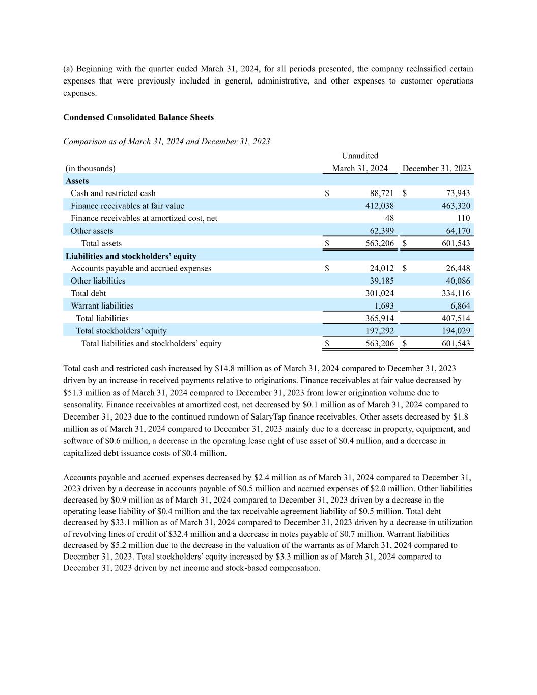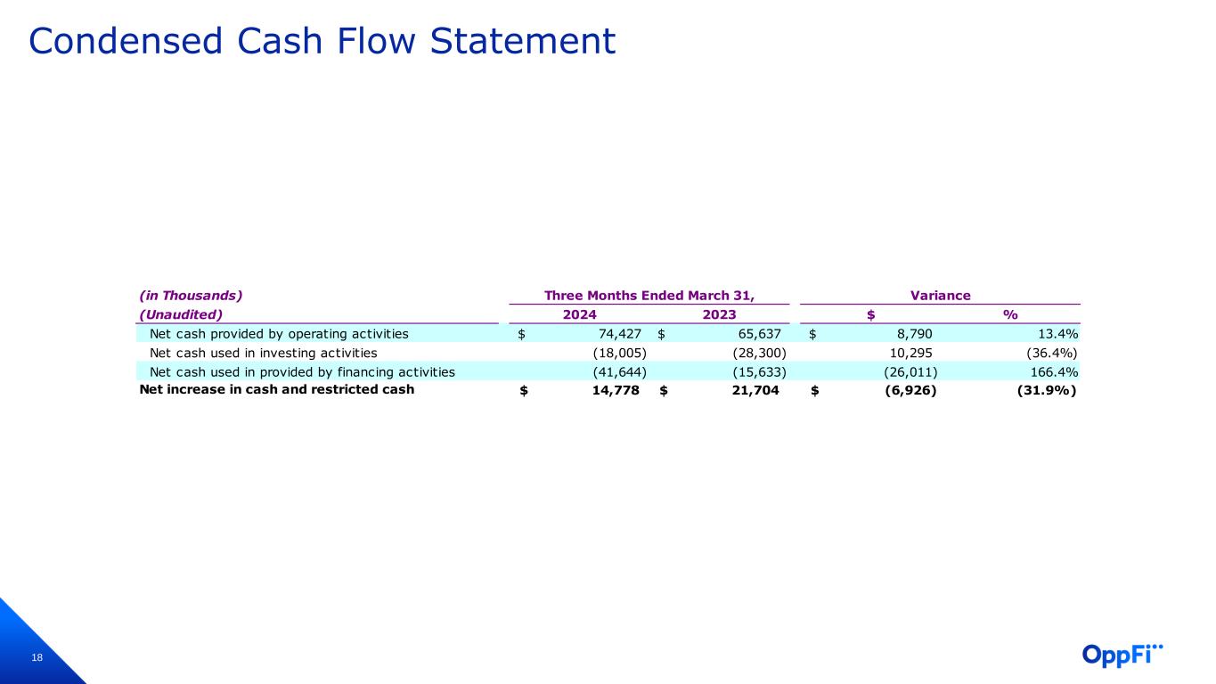 17 Condensed Balance Sheet March 31, December 31, (in Thousands) 2024 2023 $ % Unaudited Assets Cash and restricted cash 88,721$ 73,943$ 14,778$ 20.0% Finance receivables at fair value 412,038 463,320 (51,282) (11.1%) Finance receivables at amortized cost, net 48 110 (62) (56.4%) Other assets 62,399 64,170 (1,771) (2.8%) Total assets 563,206$ 601,543$ (38,337)$ (6.4%) Liabilities and stockholders' equity Accounts payable and accured expenses 24,012$ 26,448$ (2,436)$ (9.2%) Other liabilities 39,185 40,086 (901) (2.2%) Total debt 301,024 334,116 (33,092) (9.9%) Warrant liabilities 1,693 6,864 (5,171) (75.3%) Total liabilities 365,914$ 407,514$ (41,600)$ (10.2%) Total stockholders' equity 197,292 194,029 3,263 1.7% Total liabilities and stockholders' equity 563,206$ 601,543$ (38,337)$ (6.4%) Variance