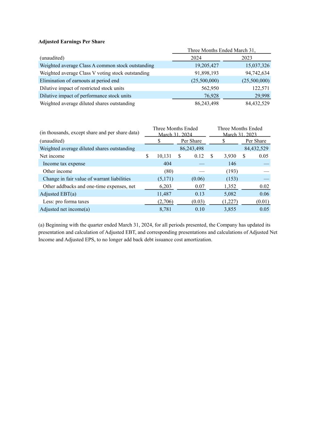 20 Q1 2024 Diluted Shares as Reflected in Adjusted Earnings Per Share (Unaudited) 2024 2023 Weighted average Class A common stock outstanding 19,205,427 15,037,326 Weighted average Class V voting stock outstanding 91,898,193 94,742,634 Elimination of earnouts at period end (25,500,000) (25,500,000) Dilutive impact of restricted stock units 562,950 122,571 Dilutive impact of performance stock units 76,928 29,998 Weighted average diluted shares outstanding 86,243,498 84,432,529 Three Months Ended March 31,