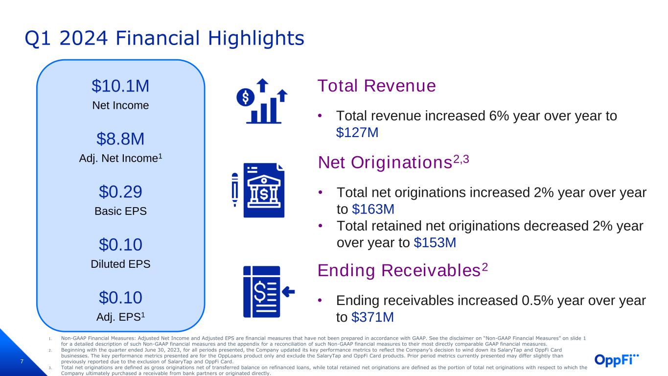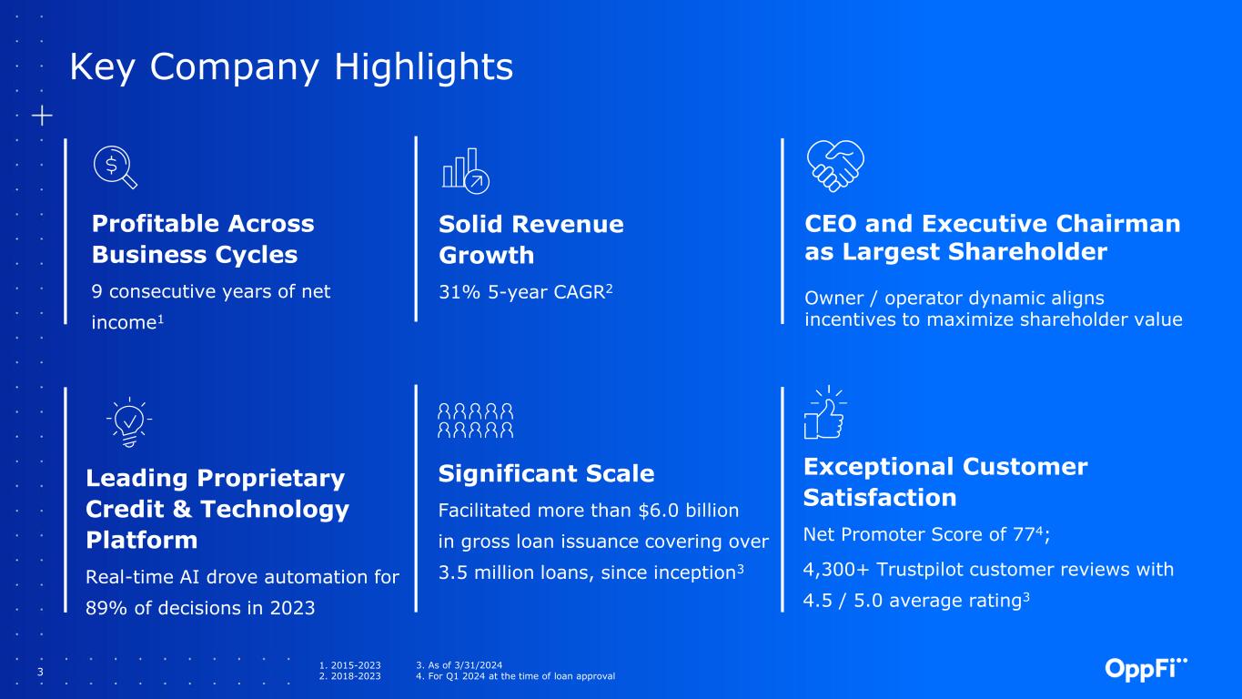 2 Q1 2024 Highlights 3.5 percentage point increase year over year in total revenue yield to 129.5%3 33.5% increase year over year in recoveries of previously charged off receivables 110 basis point decrease year over year in annualized net charge-off rate as a percentage of total revenue to 47.9%3 5.8% increase year over year in total revenue to $127.3 million Net income of $10.1 million up from $3.9 million year over year, and adjusted net income of $8.8 million up from $3.9 million year over year1,2 Exceeded adjusted EPS guidance and raised full-year outlook for adjusted net income and adjusted EPS 1. Adjusted net income is a financial measure that has not been prepared in accordance with Generally Accepted Accounting Principles (“GAAP”). See the disclaimer on “Non-GAAP Financial Measures” on slide 1 for a detailed description of such Non-GAAP financial measures and the appendix for a reconciliation of Non-GAAP financial measures to their most directly comparable GAAP financial measures. 2. Beginning with the quarter ended March 31, 2024, for all periods presented, the Company has updated its presentation and calculation of Adjusted EBT, and the corresponding presentations and calculations of Adjusted Net Income and Adjusted EPS, to no longer add back debt issuance cost amortization. 3. Beginning with the quarter ended June 30, 2023, for all periods presented, the Company updated its key performance metrics to reflect the Company’s decision to wind down its SalaryTap and OppFi Card businesses. The key performance metrics presented are for the OppLoans product only and exclude the SalaryTap and OppFi Card products. Prior period metrics currently presented may differ slightly than previously reported due to the exclusion of SalaryTap and OppFi Card.