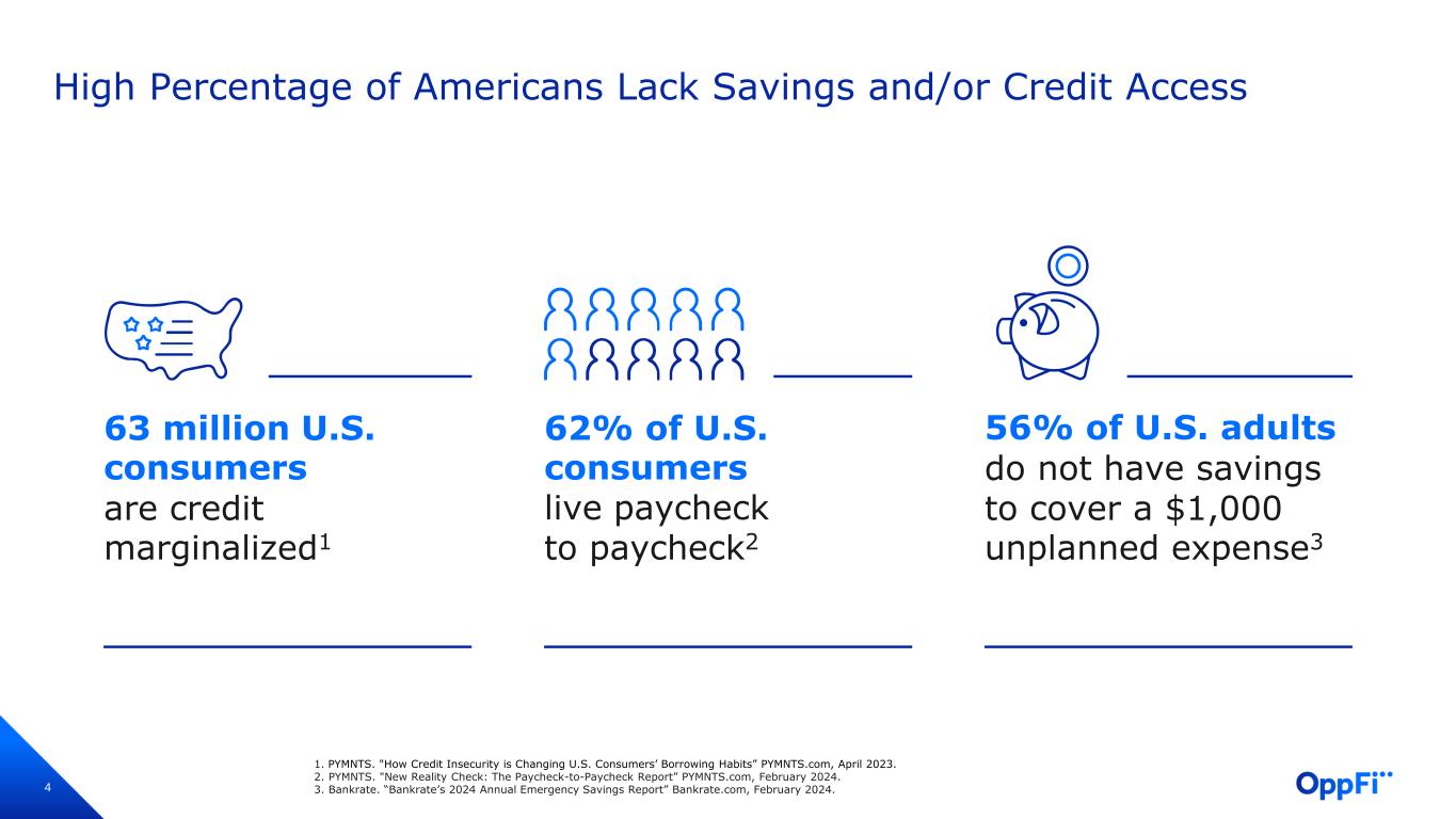 1 Disclaimer This presentation (the “Presentation”) of OppFi Inc. (“OppFi” or the “Company”) is for information purposes only. Certain information contained herein has been derived from sources prepared by third parties. While such information is believed to be reliable for the purposes used herein, the Company makes no representation or warranty with respect to the accuracy of such information. Trademarks and trade names referred to in this Presentation are the property of their respective owners. The information contained herein does not purport to be all-inclusive. This Presentation does not constitute investment, tax, or legal advice. No representation or warranty, express or implied, is or will be given by the Company or any of its respective affiliates, directors, officers, employees or advisers or any other person as to the accuracy or completeness of the information in this Presentation, and no responsibility or liability whatsoever is accepted for the accuracy or sufficiency thereof or for any errors, omissions or misstatements, negligent or otherwise, relating thereto. The information contained in this Presentation is preliminary in nature and is subject to change, and any such changes may be material. The Company disclaims any duty to update the information contained in this Presentation, which information is given only as of the date of this Presentation unless otherwise stated herein. Forward-Looking Statements This Presentation includes “forward-looking statements” within the meaning of the “safe harbor” provisions of the Private Securities Litigation Reform Act of 1995, Section 27A of the Securities Act of 1933, as amended, and Section 21E of the Securities Exchange Act of 1934, as amended. OppFi’s actual results may differ from its expectations, estimates and projections and consequently, you should not rely on these forward-looking statements as predictions of future events. Words such as “expect,” “estimate,” “project,” “budget,” “forecast,” “anticipate,” “intend,” “plan,” “may,” “will,” “could,” “should,” “believes,” “predicts,” “potential,” “possible,” “continue,” and similar expressions may identify forward-looking statements, but the absence of these words does not mean that a statement is not forward-looking. These forward-looking statements include, without limitation, OppFi’s expectations with respect to its full year 2024 guidance, the future performance of OppFi’s platform, and expectations for OppFi’s growth, new products, and future financial performance. These forward-looking statements are based on OppFi’s current expectations and assumptions about future events and are based on currently available information as to the outcome and timing of future events. These forward-looking statements involve significant risks and uncertainties that could cause the actual results to differ materially from the expected results. Most of these factors are outside OppFi’s control and are difficult to predict. Factors that may cause such differences include, but are not limited to: the impact of general economic conditions, including economic slowdowns, inflation, interest rate changes, recessions, and tightening of credit markets on OppFi’s business; the impact of challenging macroeconomic and marketplace conditions, including lingering effects of COVID-19 on OppFi’s business; the impact of stimulus or other government programs; whether OppFi will be successful in obtaining declaratory relief against the Commissioner of the Department of Financial Protection and Innovation for the State of California; whether OppFi will be subject to AB 539; whether OppFi’s bank partners will continue to lend in California and whether OppFi’s financing sources will continue to finance the purchase of participation rights in loans originated by OppFi’s bank partners in California; the impact that events involving financial institutions or the financial services industry generally, such as actual concerns or events involving liquidity, defaults, or non-performance, may have on OppFi’s business; risks related to the material weakness in OppFi’s internal controls over financial reporting; the ability of OppFi to grow and manage growth profitably and retain its key employees; risks related to new products; risks related to evaluating and potentially consummating acquisitions; concentration risk; risks related to OppFi's ability to comply with various covenants in its corporate and warehouse credit facilities; costs related to the business combination; changes in applicable laws or regulations; the possibility that OppFi may be adversely affected by other economic, business, and/or competitive factors; risks related to management transitions; risks related to the restatement of OppFi’s financial statements and any accounting deficiencies or weaknesses related thereto; and other risks and uncertainties indicated from time to time in OppFi’s filings with the United States Securities and Exchange Commission, in particular, contained in the section or sections captioned “Risk Factors.” OppFi cautions that the foregoing list of factors is not exclusive, and readers should not place undue reliance upon any forward-looking statements, which speak only as of the date made. OppFi does not undertake or accept any obligation or undertaking to release publicly any updates or revisions to any forward-looking statements to reflect any change in its expectations or any change in events, conditions or circumstances on which any such statement is based. Non-GAAP Financial Measures Certain financial information and data contained in this Presentation are unaudited and do not conform to Regulation S-X. Accordingly, such information and data may not be included in, may be adjusted in or may be presented differently in, any periodic filing, information or proxy statement, or prospectus or registra