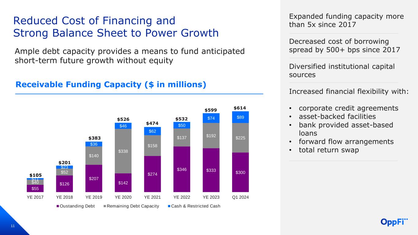 10 Condensed Balance Sheet ($ in millions) 3/31/2024 12/31/2023 Assets Cash and Restricted Cash $88.7 $73.9 Finance Receivables at Fair Value 412.0 463.3 Finance Receivables at Amortized Cost, Net 0.1 0.1 Other Assets 62.4 64.2 Total Assets $563.2 $601.5 Liabilities and Stockholders’ Equity Accounts Payable and Accrued Expenses $24.0 $26.4 Other Liabilities 39.2 40.1 Total Debt 301.0 334.1 Warrant Liabilities 1.7 6.9 Total Liabilities 365.9 407.5 Total Stockholders’ Equity 197.3 194.0 Total Liabilities and Stockholders’ Equity $563.2 $601.5 Total cash and restricted cash increased by $15 million driven by an increase in received payments relative to originations and partially offset by payments of debt Finance receivables at fair value decreased by $51 million due to first quarter seasonality, which typically sees a decrease in receivables due to an increase in payments from tax season Total debt decreased by $33 million driven by a decline in utilization of revolving lines of credit Equity increased by $3 million driven by net income and stock-based compensation Key Highlights UNAUDITED
