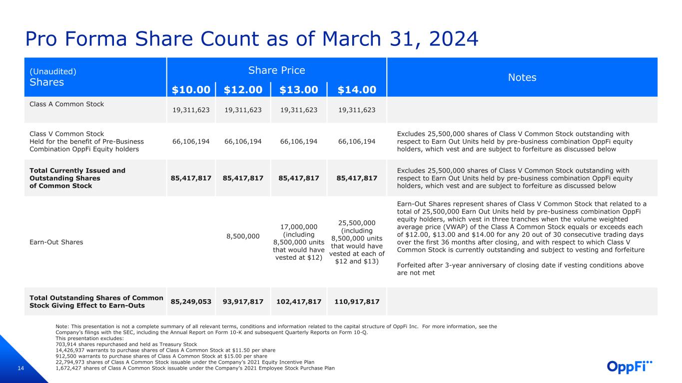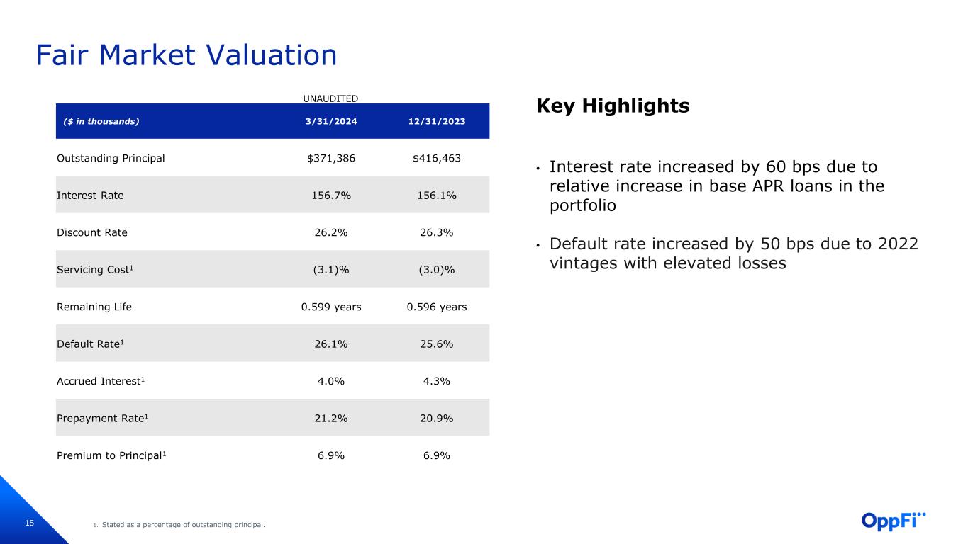 14 Pro Forma Share Count as of March 31, 2024 (Unaudited) Shares Share Price Notes $10.00 $12.00 $13.00 $14.00 Class A Common Stock 19,311,623 19,311,623 19,311,623 19,311,623 Class V Common Stock Held for the benefit of Pre-Business Combination OppFi Equity holders 66,106,194 66,106,194 66,106,194 66,106,194 Excludes 25,500,000 shares of Class V Common Stock outstanding with respect to Earn Out Units held by pre-business combination OppFi equity holders, which vest and are subject to forfeiture as discussed below Total Currently Issued and Outstanding Shares of Common Stock 85,417,817 85,417,817 85,417,817 85,417,817 Excludes 25,500,000 shares of Class V Common Stock outstanding with respect to Earn Out Units held by pre-business combination OppFi equity holders, which vest and are subject to forfeiture as discussed below Earn-Out Shares 8,500,000 17,000,000 (including 8,500,000 units that would have vested at $12) 25,500,000 (including 8,500,000 units that would have vested at each of $12 and $13) Earn-Out Shares represent shares of Class V Common Stock that related to a total of 25,500,000 Earn Out Units held by pre-business combination OppFi equity holders, which vest in three tranches when the volume weighted average price (VWAP) of the Class A Common Stock equals or exceeds each of $12.00, $13.00 and $14.00 for any 20 out of 30 consecutive trading days over the first 36 months after closing, and with respect to which Class V Common Stock is currently outstanding and subject to vesting and forfeiture Forfeited after 3-year anniversary of closing date if vesting conditions above are not met Total Outstanding Shares of Common Stock Giving Effect to Earn-Outs 85,249,053 93,917,817 102,417,817 110,917,817 Note: This presentation is not a complete summary of all relevant terms, conditions and information related to the capital structure of OppFi Inc. For more information, see the Company’s filings with the SEC, including the Annual Report on Form 10-K and subsequent Quarterly Reports on Form 10-Q. This presentation excludes: 703,914 shares repurchased and held as Treasury Stock 14,426,937 warrants to purchase shares of Class A Common Stock at $11.50 per share 912,500 warrants to purchase shares of Class A Common Stock at $15.00 per share 22,794,973 shares of Class A Common Stock issuable under the Company’s 2021 Equity Incentive Plan 1,672,427 shares of Class A Common Stock issuable under the Company’s 2021 Employee Stock Purchase Plan
