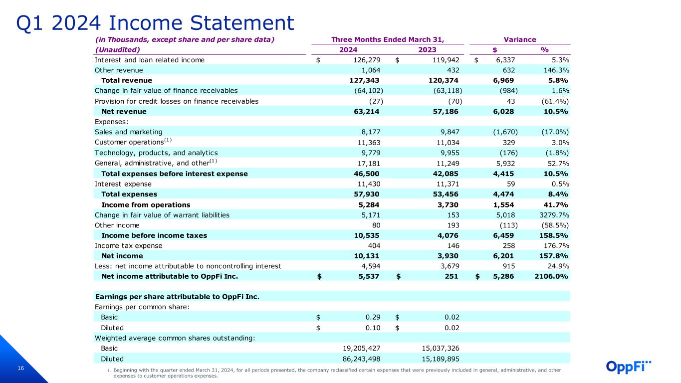 16 Q1 2024 Income Statement 1. Beginning with the quarter ended March 31, 2024, for all periods presented, the company reclassified certain expenses that were previously included in general, administrative, and other expenses to customer operations expenses. (in Thousands, except share and per share data) (Unaudited) 2024 2023 $ % Interest and loan related income 126,279$ 119,942$ 6,337$ 5.3% Other revenue 1,064 432 632 146.3% Total revenue 127,343 120,374 6,969 5.8% Change in fair value of finance receivables (64,102) (63,118) (984) 1.6% Provision for credit losses on finance receivables (27) (70) 43 (61.4%) Net revenue 63,214 57,186 6,028 10.5% Expenses: Sales and marketing 8,177 9,847 (1,670) (17.0%) Customer operations(1) 11,363 11,034 329 3.0% Technology, products, and analytics 9,779 9,955 (176) (1.8%) General, administrative, and other(1) 17,181 11,249 5,932 52.7% Total expenses before interest expense 46,500 42,085 4,415 10.5% Interest expense 11,430 11,371 59 0.5% Total expenses 57,930 53,456 4,474 8.4% Income from operations 5,284 3,730 1,554 41.7% Change in fair value of warrant liabilities 5,171 153 5,018 3279.7% Other income 80 193 (113) (58.5%) Income before income taxes 10,535 4,076 6,459 158.5% Income tax expense 404 146 258 176.7% Net income 10,131 3,930 6,201 157.8% Less: net income attributable to noncontrolling interest 4,594 3,679 915 24.9% Net income attributable to OppFi Inc. 5,537$ 251$ 5,286$ 2106.0% Earnings per share attributable to OppFi Inc. Earnings per common share: Basic 0.29$ 0.02$ Diluted 0.10$ 0.02$ Weighted average common shares outstanding: Basic 19,205,427 15,037,326 Diluted 86,243,498 15,189,895 Three Months Ended March 31, Variance