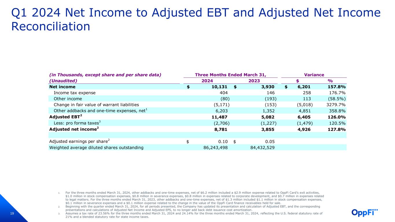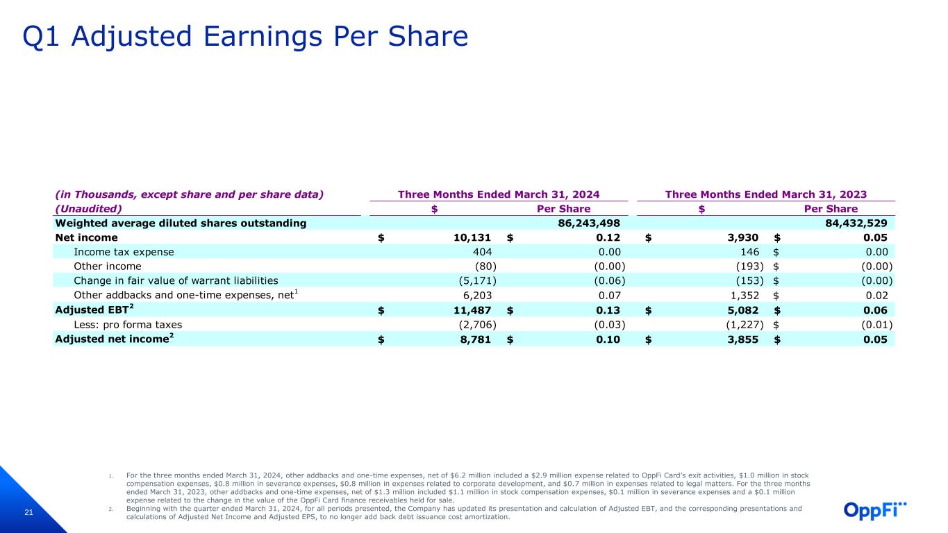 21 Q1 Adjusted Earnings Per Share 1. For the three months ended March 31, 2024, other addbacks and one-time expenses, net of $6.2 million included a $2.9 million expense related to OppFi Card’s exit activities, $1.0 million in stock compensation expenses, $0.8 million in severance expenses, $0.8 million in expenses related to corporate development, and $0.7 million in expenses related to legal matters. For the three months ended March 31, 2023, other addbacks and one-time expenses, net of $1.3 million included $1.1 million in stock compensation expenses, $0.1 million in severance expenses and a $0.1 million expense related to the change in the value of the OppFi Card finance receivables held for sale. 2. Beginning with the quarter ended March 31, 2024, for all periods presented, the Company has updated its presentation and calculation of Adjusted EBT, and the corresponding presentations and calculations of Adjusted Net Income and Adjusted EPS, to no longer add back debt issuance cost amortization. (in Thousands, except share and per share data) (Unaudited) $ Per Share $ Per Share Weighted average diluted shares outstanding 86,243,498 84,432,529 Net income 10,131$ 0.12$ 3,930$ 0.05$ Income tax expense 404 0.00 146 0.00$ Other income (80) (0.00) (193) (0.00)$ Change in fair value of warrant liabilities (5,171) (0.06) (153) (0.00)$ Other addbacks and one-time expenses, net 1 6,203 0.07 1,352 0.02$ Adjusted EBT 2 11,487$ 0.13$ 5,082$ 0.06$ Less: pro forma taxes (2,706) (0.03) (1,227) (0.01)$ Adjusted net income 2 8,781$ 0.10$ 3,855$ 0.05$ Three Months Ended March 31, 2024 Three Months Ended March 31, 2023