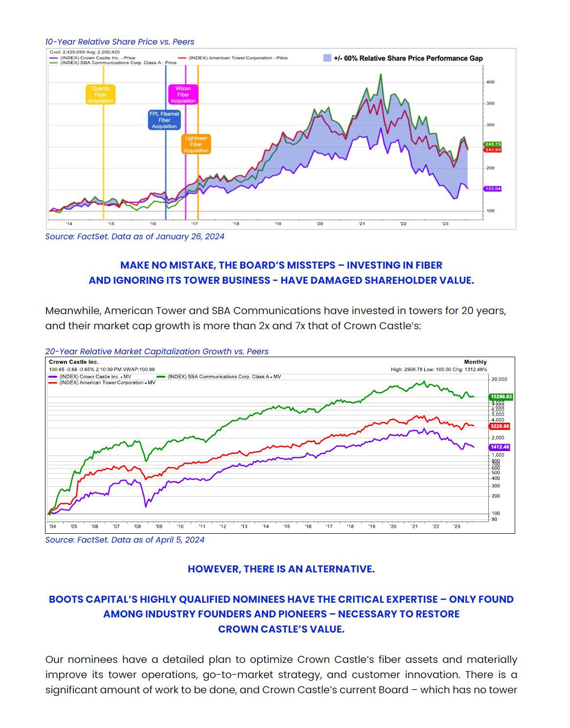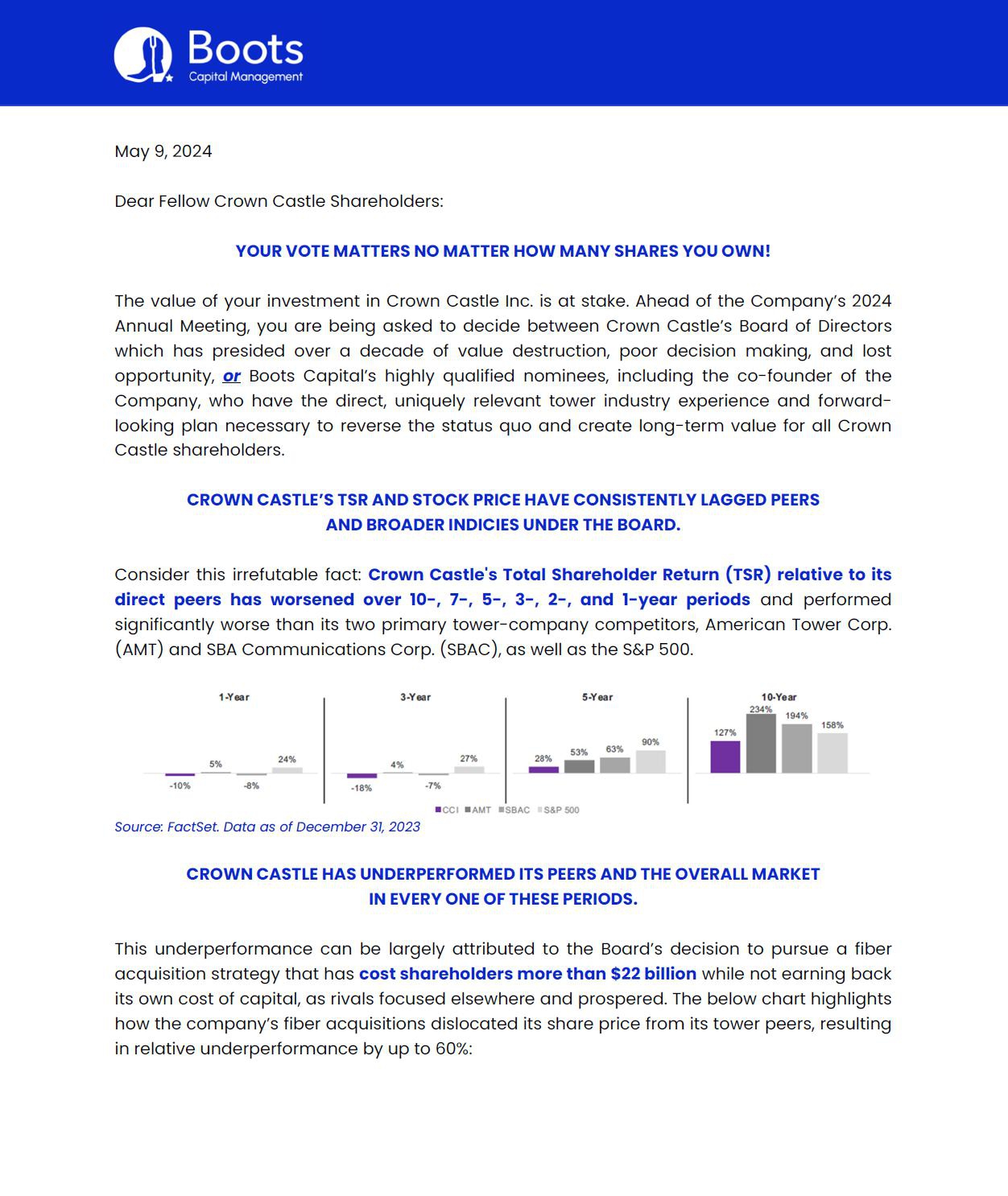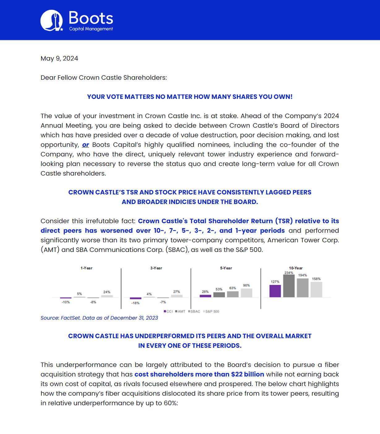 Boots Capital Management, LLC (“Boots Capital”), together with the other Participants named herein (“Boots”), have filed a definitive proxy statement and accompanying GOLD universal proxy card with the Securities and Exchange Commission (the “SEC”) to be used to solicit proxies for, among other matters, the election of their slate of director nominees at the 2024 annual meeting of stockholders (the “2024 Annual Meeting”) of Crown Castle Inc., a Delaware corporation (“Crown Castle” or the “Corporation”). From time to time, Crown Castle and the other participants named herein may refer shareholders of the Corporation to such materials reproduced herein, recent articles or other materials.