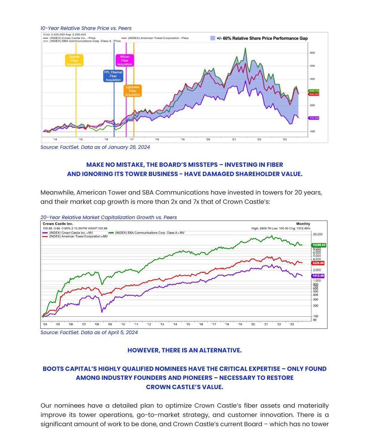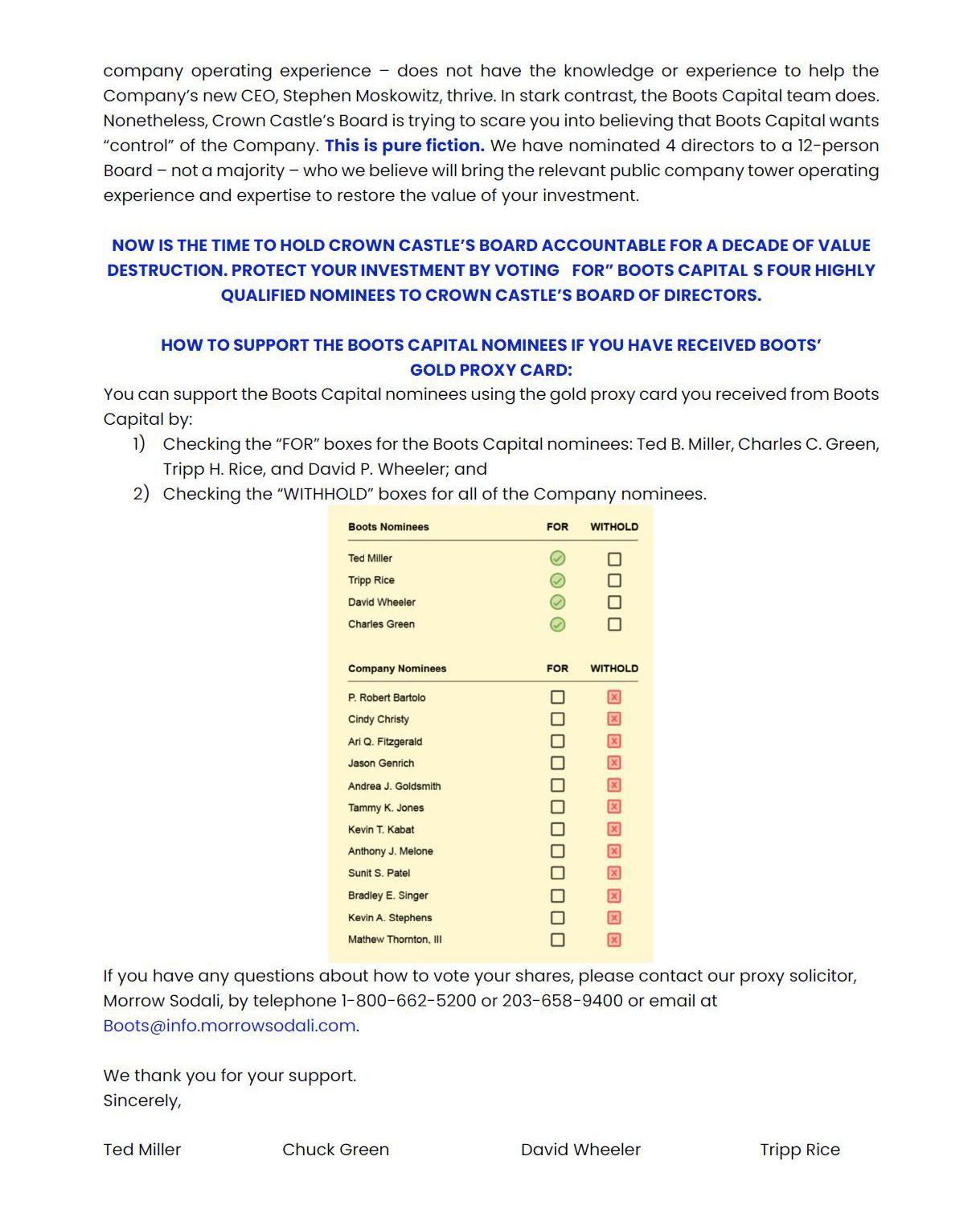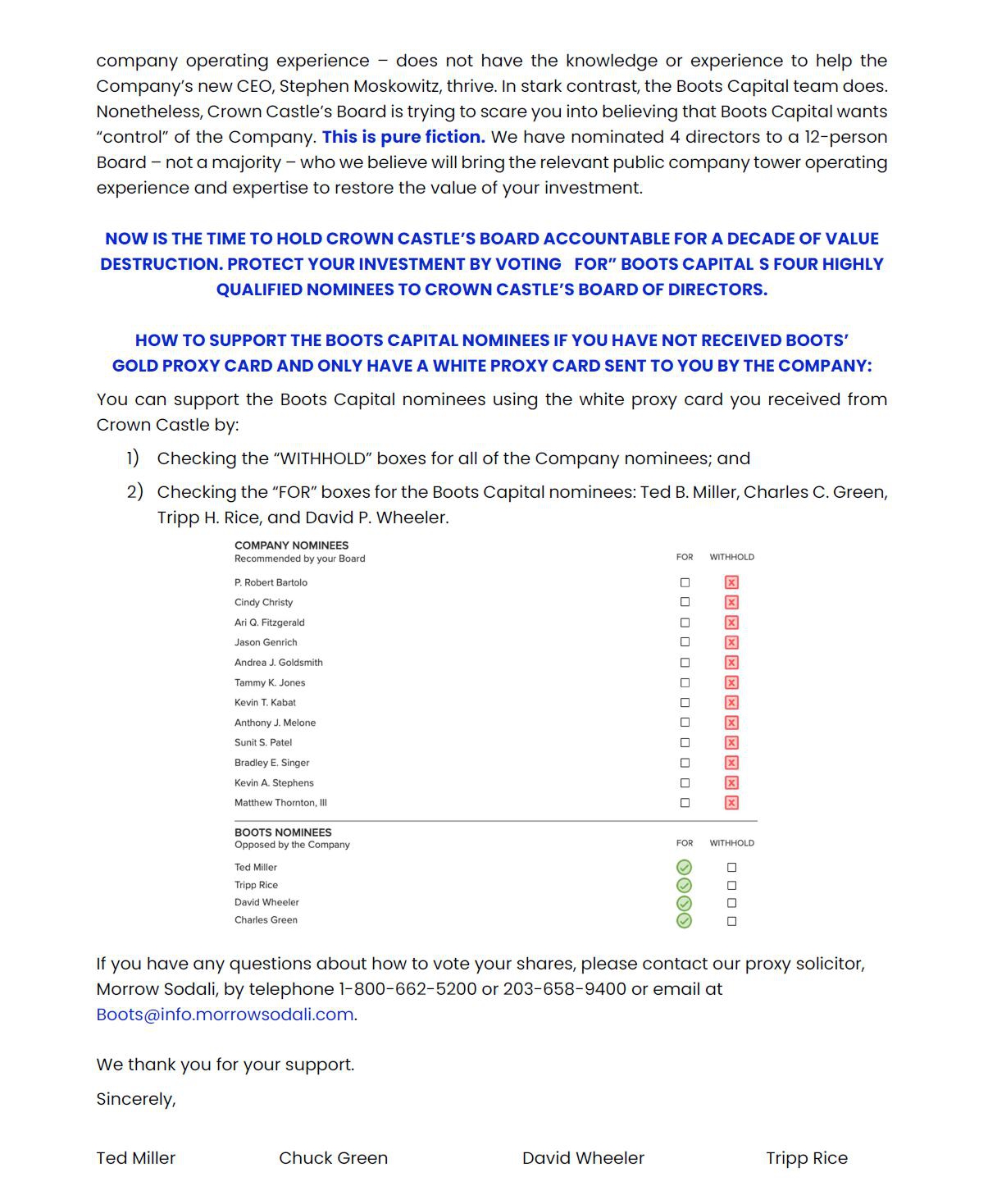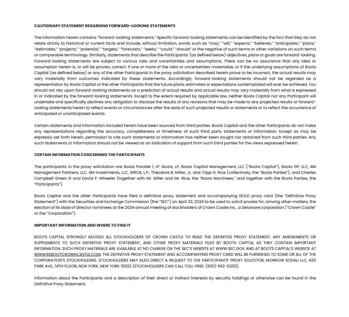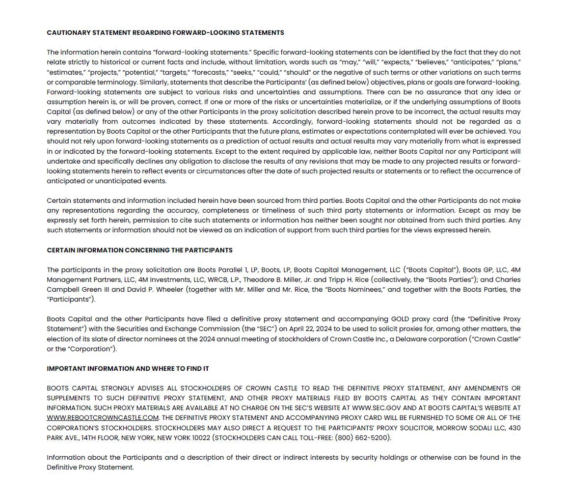 BOOTS CAPITAL STRONGLY ADVISES ALL STOCKHOLDERS OF CROWN CASTLE TO READ THE DEFINITIVE PROXY STATEMENT, ANY AMENDMENTS OR SUPPLEMENTS TO SUCH DEFINITIVE PROXY STATEMENT, AND OTHER PROXY MATERIALS FILED BY BOOTS CAPITAL AS THEY CONTAIN IMPORTANT INFORMATION. SUCH PROXY MATERIALS ARE AVAILABLE AT NO CHARGE ON THE SEC’S WEBSITE AT WWW.SEC.GOV AND AT BOOTS CAPITAL’S WEBSITE AT WWW.REBOOTCROWNCASTLE.COM. THE DEFINITIVE PROXY STATEMENT AND ACCOMPANYING PROXY CARD WILL BE FURNISHED TO SOME OR ALL OF THE CORPORATION’S STOCKHOLDERS. STOCKHOLDERS MAY ALSO DIRECT A REQUEST TO THE PARTICIPANTS’ PROXY SOLICITOR, MORROW SODALI LLC, 430 PARK AVE., 14TH FLOOR, NEW YORK, NEW YORK 10022 (STOCKHOLDERS CAN CALL TOLL-FREE: (800) 662-5200).