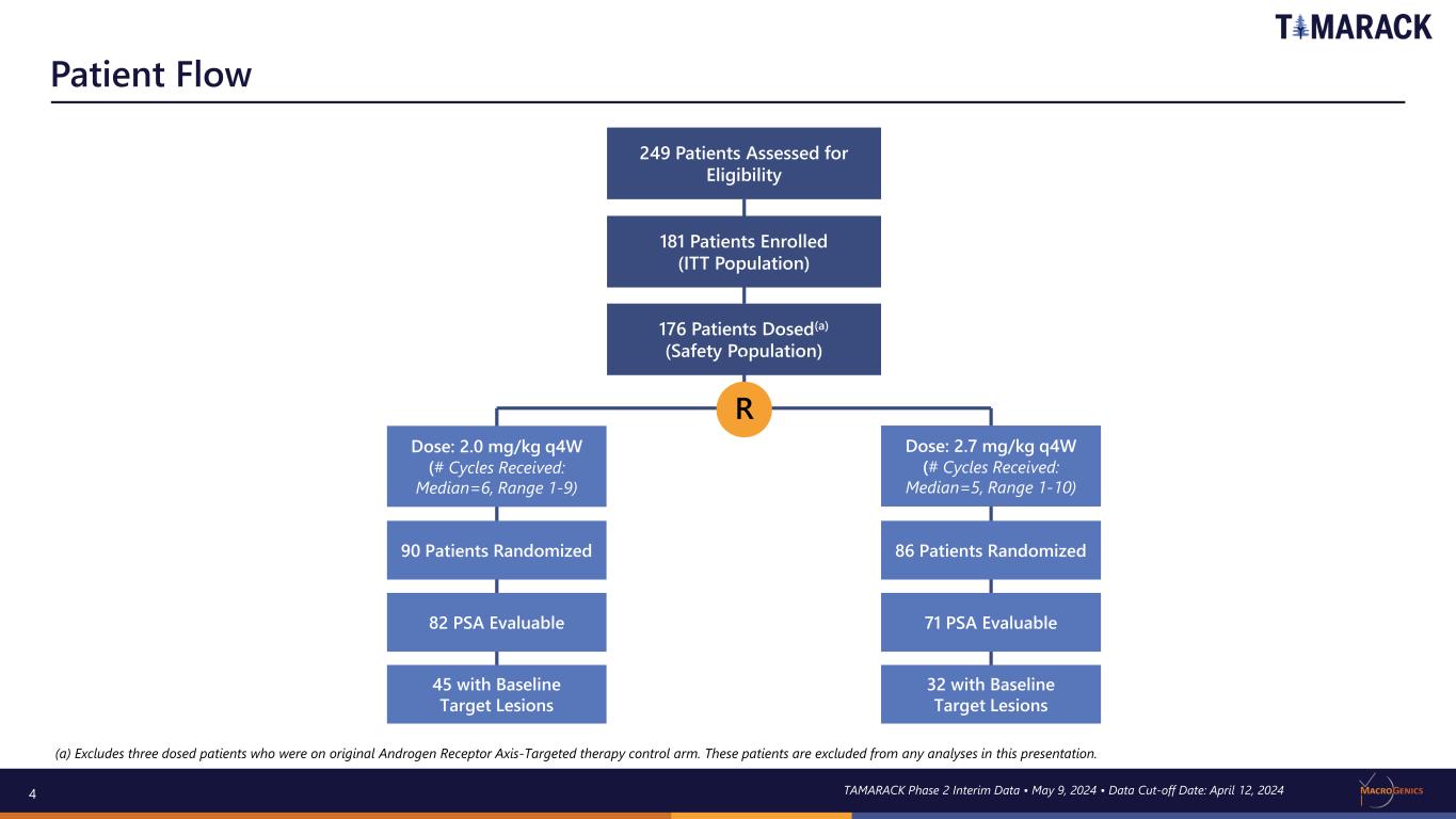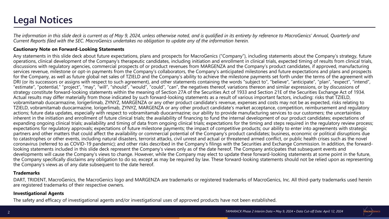 2 Legal Notices The information in this slide deck is current as of May 9, 2024, unless otherwise noted, and is qualified in its entirety by reference to MacroGenics’ Annual, Quarterly and Current Reports filed with the SEC. MacroGenics undertakes no obligation to update any of the information herein. Cautionary Note on Forward-Looking Statements Any statements in this slide deck about future expectations, plans and prospects for MacroGenics (“Company”), including statements about the Company’s strategy, future operations, clinical development of the Company’s therapeutic candidates, including initiation and enrollment in clinical trials, expected timing of results from clinical trials, discussions with regulatory agencies, commercial prospects of or product revenues from MARGENZA and the Company’s product candidates, if approved, manufacturing services revenue, milestone or opt-in payments from the Company’s collaborators, the Company’s anticipated milestones and future expectations and plans and prospects for the Company, as well as future global net sales of TZIELD and the Company’s ability to achieve the milestone payments set forth under the terms of the agreement with DRI (or its successors or assigns with respect to such agreement), and other statements containing the words “subject to”, "believe", “anticipate”, “plan”, “expect”, “intend”, “estimate”, “potential,” “project”, “may”, “will”, “should”, “would”, “could”, “can”, the negatives thereof, variations thereon and similar expressions, or by discussions of strategy constitute forward-looking statements within the meaning of Section 27A of the Securities Act of 1933 and Section 21E of the Securities Exchange Act of 1934. Actual results may differ materially from those indicated by such forward-looking statements as a result of various important factors, including: risks that TZIELD, vobramitamab duocarmazine, lorigerlimab, ZYNYZ, MARGENZA or any other product candidate’s revenue, expenses and costs may not be as expected, risks relating to TZIELD, vobramitamab duocarmazine, lorigerlimab, ZYNYZ, MARGENZA or any other product candidate’s market acceptance, competition, reimbursement and regulatory actions; future data updates, especially with respect to vobramitamab duocarmazine; our ability to provide manufacturing services to our customers; the uncertainties inherent in the initiation and enrollment of future clinical trials; the availability of financing to fund the internal development of our product candidates; expectations of expanding ongoing clinical trials; availability and timing of data from ongoing clinical trials; expectations for the timing and steps required in the regulatory review process; expectations for regulatory approvals; expectations of future milestone payments; the impact of competitive products; our ability to enter into agreements with strategic partners and other matters that could affect the availability or commercial potential of the Company's product candidates; business, economic or political disruptions due to catastrophes or other events, including natural disasters, terrorist attacks, civil unrest and actual or threatened armed conflict, or public health crises such as the novel coronavirus (referred to as COVID-19 pandemic); and other risks described in the Company's filings with the Securities and Exchange Commission. In addition, the forward- looking statements included in this slide deck represent the Company's views only as of the date hereof. The Company anticipates that subsequent events and developments will cause the Company's views to change. However, while the Company may elect to update these forward-looking statements at some point in the future, the Company specifically disclaims any obligation to do so, except as may be required by law. These forward-looking statements should not be relied upon as representing the Company's views as of any date subsequent to the date hereof. Trademarks DART, TRIDENT, MacroGenics, the MacroGenics logo and MARGENZA are trademarks or registered trademarks of MacroGenics, Inc. All third-party trademarks used herein are registered trademarks of their respective owners. Investigational Agents The safety and efficacy of investigational agents and/or investigational uses of approved products have not been established. TAMARACK Phase 2 Interim Data • May 9, 2024 • Data Cut-off Date: April 12, 2024