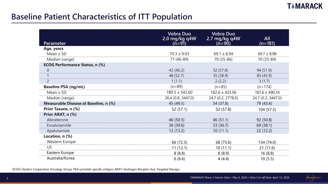 4 Patient Flow TAMARACK Phase 2 Interim Data • May 9, 2024 • Data Cut-off Date: April 12, 2024 (a) Excludes three dosed patients who were on original Androgen Receptor Axis-Targeted therapy control arm. These patients are excluded from any analyses in this presentation. 249 Patients Assessed for Eligibility 181 Patients Enrolled (ITT Population) 176 Patients Dosed(a) (Safety Population) Dose: 2.0 mg/kg q4W (# Cycles Received: Median=6, Range 1-9) Dose: 2.7 mg/kg q4W (# Cycles Received: Median=5, Range 1-10) R 90 Patients Randomized 82 PSA Evaluable 45 with Baseline Target Lesions 86 Patients Randomized 71 PSA Evaluable 32 with Baseline Target Lesions