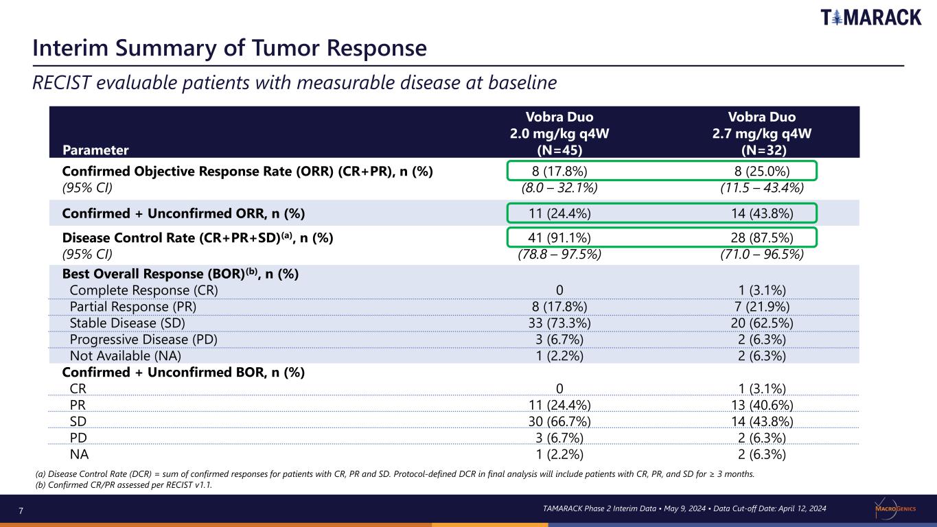 6 Interim Summary of Prostate-Specific Antigen (PSA) Response PSA response evaluable population Parameter Vobra Duo 2.0 mg/kg q4W (N=82) Vobra Duo 2.7 mg/kg q4W (N=71) Any ≥50% PSA Reduction, n (%) (95% CI) 41 (50.0%) (38.7 – 61.3) 36 (50.7%) (38.6 – 62.8) PSA Response (Confirmed ≥50% PSA Reduction), n (%) (95% CI) 36 (43.9%) (33.0 – 55.3) 26 (36.6%) (25.5 – 48.9) TAMARACK Phase 2 Interim Data • May 9, 2024 • Data Cut-off Date: April 12, 2024
