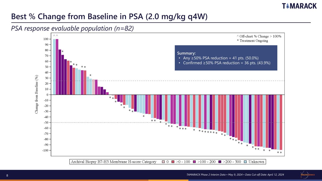 7 Interim Summary of Tumor Response RECIST evaluable patients with measurable disease at baseline Parameter Vobra Duo 2.0 mg/kg q4W (N=45) Vobra Duo 2.7 mg/kg q4W (N=32) Confirmed Objective Response Rate (ORR) (CR+PR), n (%) (95% CI) 8 (17.8%) (8.0 – 32.1%) 8 (25.0%) (11.5 – 43.4%) Confirmed + Unconfirmed ORR, n (%) 11 (24.4%) 14 (43.8%) Disease Control Rate (CR+PR+SD)(a), n (%) (95% CI) 41 (91.1%) (78.8 – 97.5%) 28 (87.5%) (71.0 – 96.5%) Best Overall Response (BOR)(b), n (%) Complete Response (CR) Partial Response (PR) Stable Disease (SD) Progressive Disease (PD) Not Available (NA) 0 8 (17.8%) 33 (73.3%) 3 (6.7%) 1 (2.2%) 1 (3.1%) 7 (21.9%) 20 (62.5%) 2 (6.3%) 2 (6.3%) Confirmed + Unconfirmed BOR, n (%) CR PR SD PD NA 0 11 (24.4%) 30 (66.7%) 3 (6.7%) 1 (2.2%) 1 (3.1%) 13 (40.6%) 14 (43.8%) 2 (6.3%) 2 (6.3%) (a) Disease Control Rate (DCR) = sum of confirmed responses for patients with CR, PR and SD. Protocol-defined DCR in final analysis will include patients with CR, PR, and SD for ≥ 3 months. (b) Confirmed CR/PR assessed per RECIST v1.1. TAMARACK Phase 2 Interim Data • May 9, 2024 • Data Cut-off Date: April 12, 2024