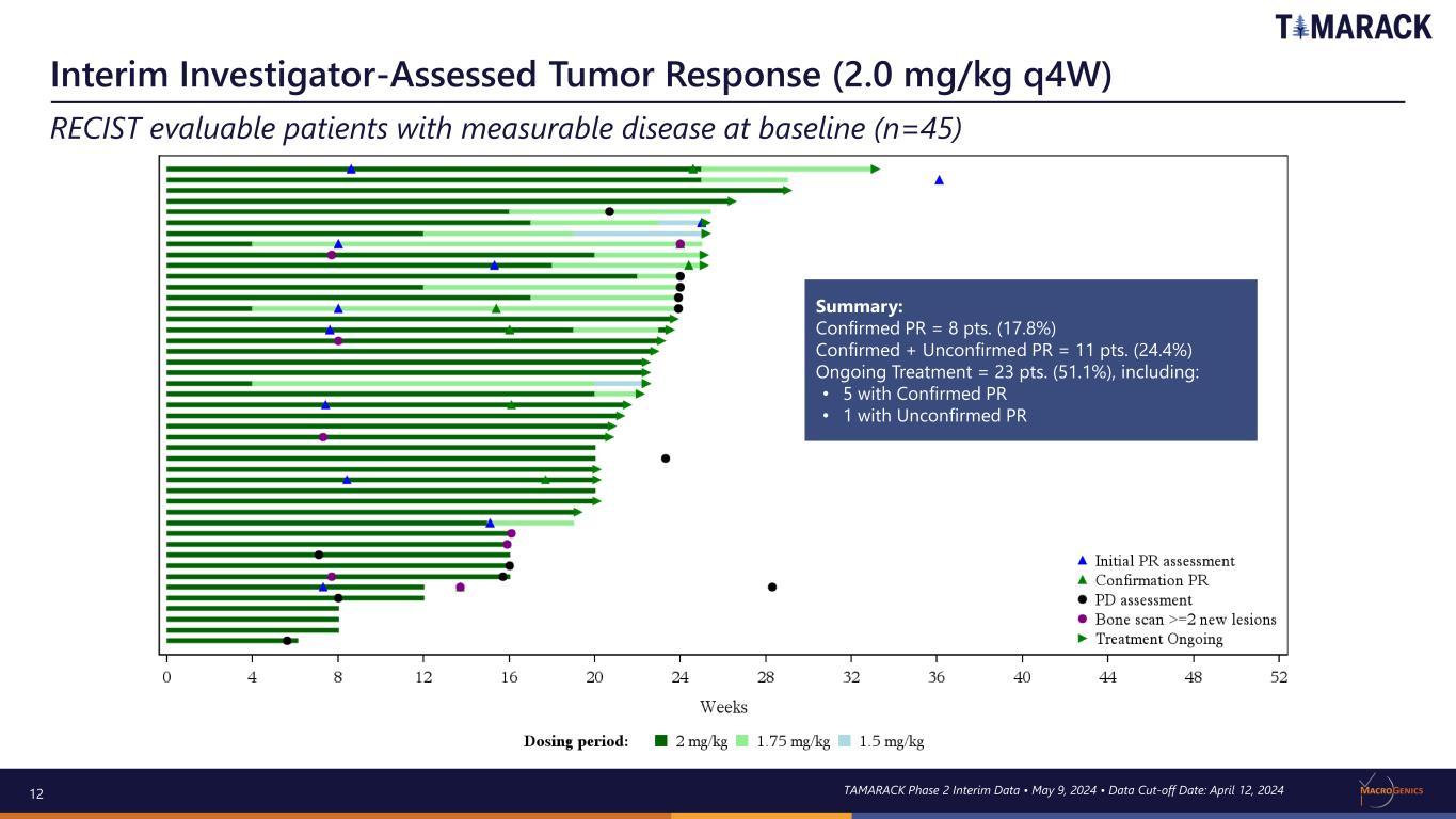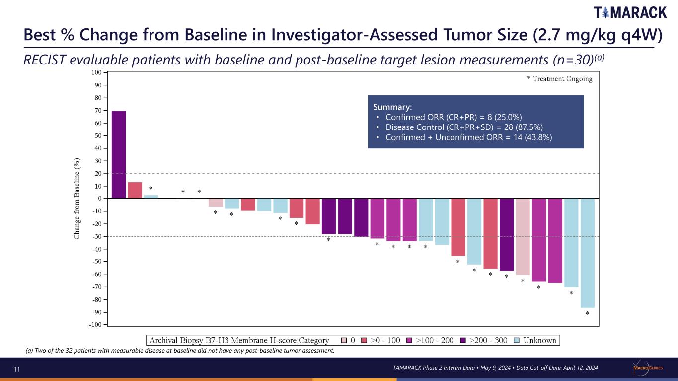 10 Best % Change from Baseline in Investigator-Assessed Tumor Size (2.0 mg/kg q4W) RECIST evaluable patients with baseline and post-baseline target lesion measurements (n=44)(a) TAMARACK Phase 2 Interim Data • May 9, 2024 • Data Cut-off Date: April 12, 2024 Summary: • Confirmed ORR (CR+PR) = 8 (17.8%) • Disease Control (CR+PR+SD) = 41 (91.1%) • Confirmed + Unconfirmed ORR = 11 (24.4%) (a) One of the 45 patients with measurable disease at baseline did not have any post-baseline tumor assessment.