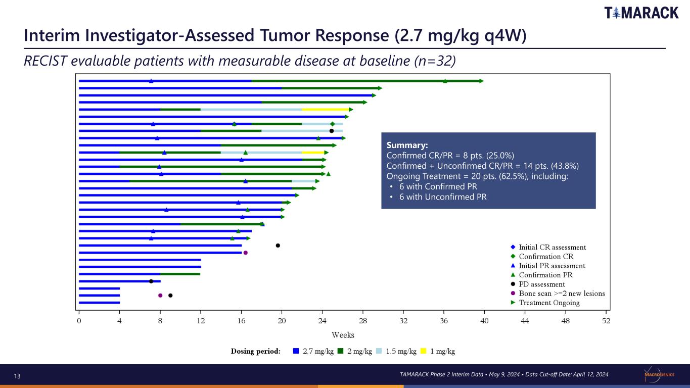 12 Interim Investigator-Assessed Tumor Response (2.0 mg/kg q4W) RECIST evaluable patients with measurable disease at baseline (n=45) TAMARACK Phase 2 Interim Data • May 9, 2024 • Data Cut-off Date: April 12, 2024 Summary: Confirmed PR = 8 pts. (17.8%) Confirmed + Unconfirmed PR = 11 pts. (24.4%) Ongoing Treatment = 23 pts. (51.1%), including: • 5 with Confirmed PR • 1 with Unconfirmed PR