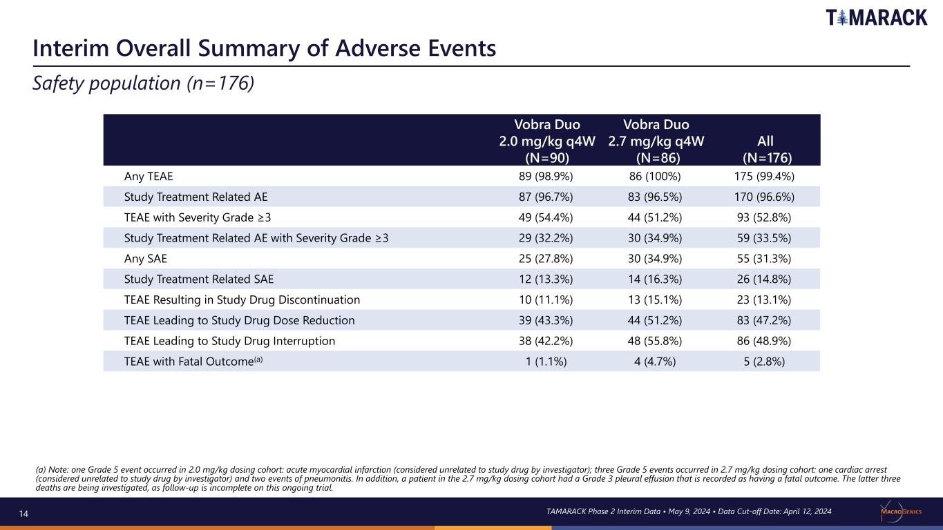13 Interim Investigator-Assessed Tumor Response (2.7 mg/kg q4W) RECIST evaluable patients with measurable disease at baseline (n=32) TAMARACK Phase 2 Interim Data • May 9, 2024 • Data Cut-off Date: April 12, 2024 Summary: Confirmed CR/PR = 8 pts. (25.0%) Confirmed + Unconfirmed CR/PR = 14 pts. (43.8%) Ongoing Treatment = 20 pts. (62.5%), including: • 6 with Confirmed PR • 6 with Unconfirmed PR