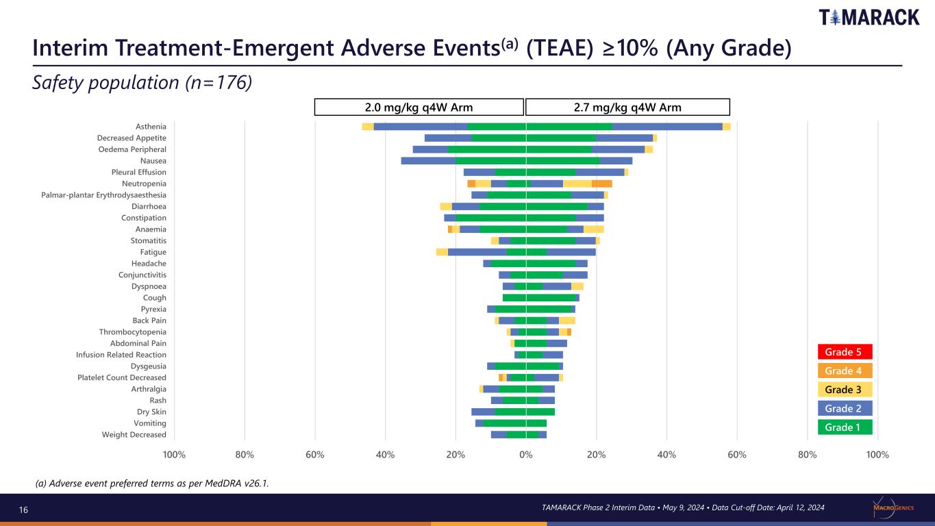 15 Interim Treatment-Emergent Adverse Events (TEAE) ≥10% (Any Grade) Safety population (n=176); Ranked by # All Grade events for 2.7 mg/kg cohort Vobra Duo 2.0 mg/kg q4W (n=90) Vobra Duo 2.7 mg/kg q4W (n=86) AE Preferred Term (MedDRA v26.1) All Grade Grade ≥3 All Grade Grade ≥3 Asthenia 42 (46.7%) 3 (3.3%) 50 (58.1%) 2 (2.3%) Decreased Appetite 26 (28.9%) 0 32 (37.2%) 1 (1.2%) Oedema Peripheral 29 (32.2%) 0 31 (36.0%) 2 (2.3%) Nausea 32 (35.6%) 0 26 (30.2%) 0 Pleural Effusion 16 (17.8%) 0 25 (29.1%) 1 (1.2%) Neutropenia 15 (16.7%) 6 (6.7%) 21 (24.4%) 12 (14.0%) Palmar-plantar Erythrodysaesthesia Syndrome 14 (15.6%) 0 20 (23.3%) 1 (1.2%) Anaemia 20 (22.2%) 3 (3.3%) 19 (22.1%) 5 (5.8%) Constipation 21 (23.3%) 0 19 (22.1%) 0 Diarrhoea 22 (24.4%) 3 (3.3%) 19 (22.1%) 0 Stomatitis 9 (10.0%) 2 (2.2%) 18 (20.9%) 1 (1.2%) Fatigue 23 (25.6%) 3 (3.3%) 17 (19.8%) 0 Conjunctivitis 7 (7.8%) 0 15 (17.4%) 0 Headache 11 (12.2%) 0 15 (17.4%) 0 Dyspnoea 6 (6.7%) 0 14 (16.3%) 3 (3.5%) Cough 6 (6.7%) 0 13 (15.1%) 0 Back Pain 8 (8.9%) 1 (1.1%) 12 (14.0%) 4 (4.7%) Pyrexia 10 (11.1%) 0 12 (14.0%) 0 Thrombocytopenia 5 (5.6%) 1 (1.1%) 11 (12.8%) 3 (3.5%) Abdominal Pain 4 (4.4%) 1 (1.1%) 10 (11.6%) 0 Platelet Count Decreased 7 (7.8%) 2 (2.2%) 9 (10.5%) 1 (1.2%) Dysgeusia 10 (11.1%) 0 9 (10.5%) 0 Infusion Related Reaction 3 (3.3%) 0 9 (10.5%) 0 Dry Skin 14 (15.6%) 0 7 (8.1%) 0 Rash 9 (10.0%) 0 7 (8.1%) 0 Arthralgia 12 (13.3%) 1 (1.1%) 7 (8.1%) 0 Weight Decreased 9 (10.0%) 0 5 (5.8%) 0 Vomiting 13 (14.4%) 0 5 (5.8%) 0 TAMARACK Phase 2 Interim Data • May 9, 2024 • Data Cut-off Date: April 12, 2024 (a) Incidence of pleural effusion for 2.0 mg/kg dosing cohort was Grade 1=8 (8.9%) and Grade 2=8 (8.9%). For 2.7 mg/kg dosing cohort, incidence was Grade 1=12 (14.0%), Grade 2=12 (14.0%) and Grade 3=1 (1.2%). (b) Incidence of palmar-plantar erythrodysaesthesia syndrome for 2.0 mg/kg dosing cohort was Grade 1=10 (11.1%) and Grade 2=4 (4.4%). For 2.7 mg/kg dosing cohort, incidence was Grade 1=11 (12.8%), Grade 2=8 (9.3%) and Grade 3=1 (1.2%).