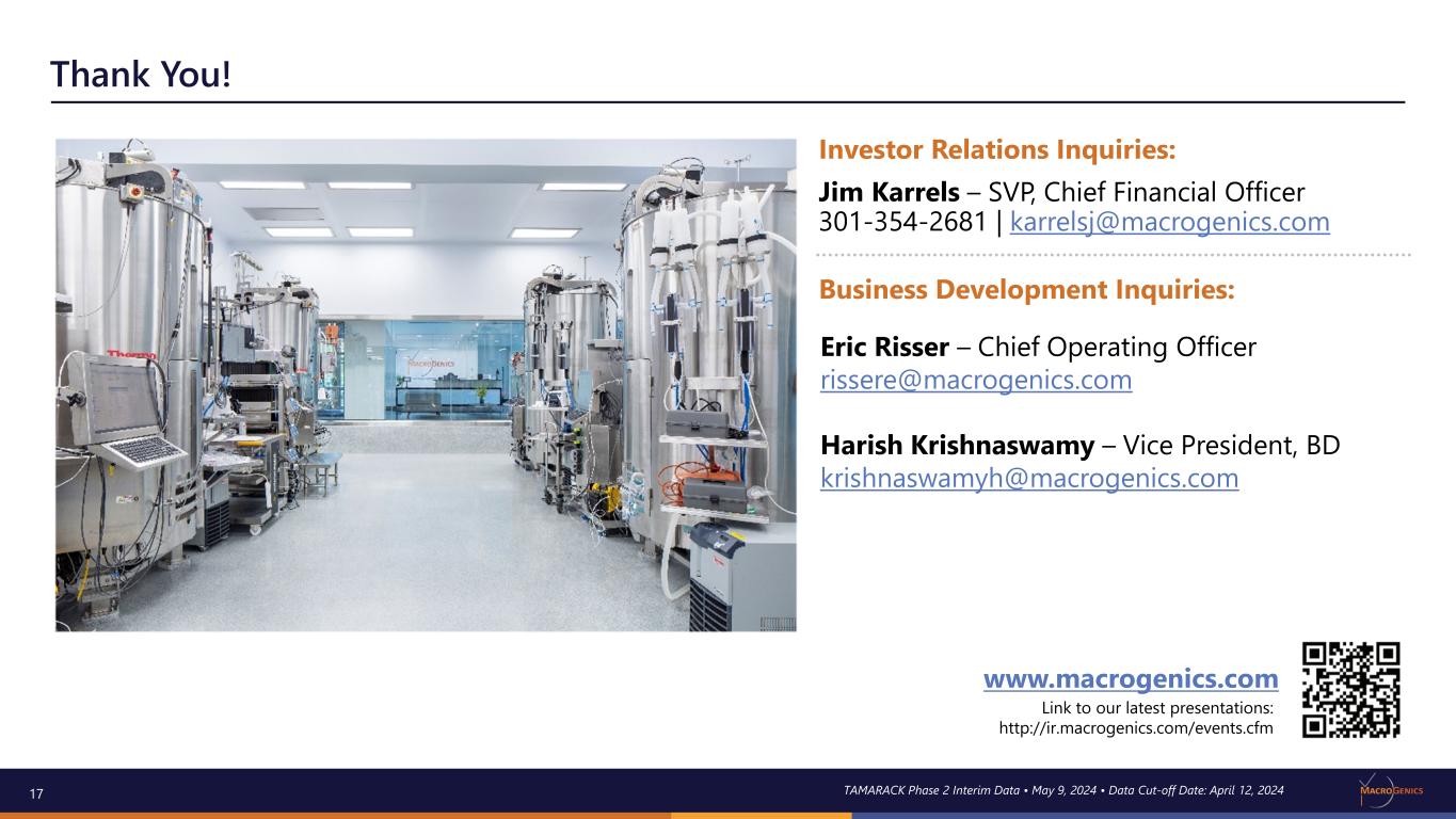 17 Thank You! Jim Karrels – SVP, Chief Financial Officer 301-354-2681 | karrelsj@macrogenics.com Link to our latest presentations: http://ir.macrogenics.com/events.cfm www.macrogenics.com Investor Relations Inquiries: Business Development Inquiries: Eric Risser – Chief Operating Officer rissere@macrogenics.com Harish Krishnaswamy – Vice President, BD krishnaswamyh@macrogenics.com TAMARACK Phase 2 Interim Data • May 9, 2024 • Data Cut-off Date: April 12, 2024