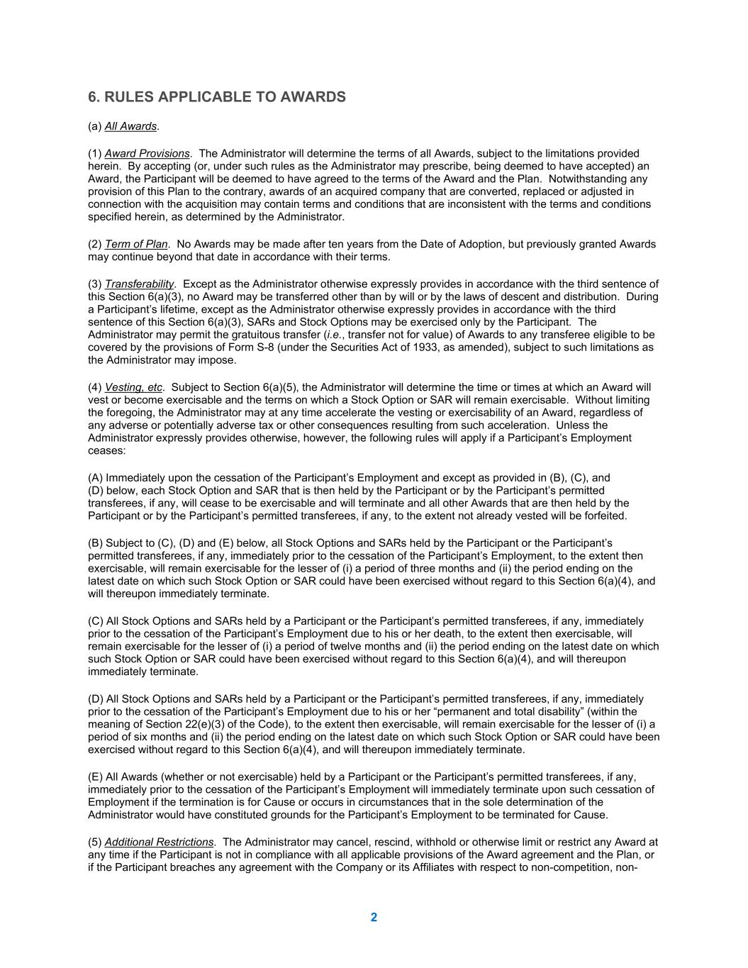 2 6. RULES APPLICABLE TO AWARDS (a) All Awards. (1) Award Provisions. The Administrator will determine the terms of all Awards, subject to the limitations provided herein. By accepting (or, under such rules as the Administrator may prescribe, being deemed to have accepted) an Award, the Participant will be deemed to have agreed to the terms of the Award and the Plan. Notwithstanding any provision of this Plan to the contrary, awards of an acquired company that are converted, replaced or adjusted in connection with the acquisition may contain terms and conditions that are inconsistent with the terms and conditions specified herein, as determined by the Administrator. (2) Term of Plan. No Awards may be made after ten years from the Date of Adoption, but previously granted Awards may continue beyond that date in accordance with their terms. (3) Transferability. Except as the Administrator otherwise expressly provides in accordance with the third sentence of this Section 6(a)(3), no Award may be transferred other than by will or by the laws of descent and distribution. During a Participant’s lifetime, except as the Administrator otherwise expressly provides in accordance with the third sentence of this Section 6(a)(3), SARs and Stock Options may be exercised only by the Participant. The Administrator may permit the gratuitous transfer (i.e., transfer not for value) of Awards to any transferee eligible to be covered by the provisions of Form S-8 (under the Securities Act of 1933, as amended), subject to such limitations as the Administrator may impose. (4) Vesting, etc. Subject to Section 6(a)(5), the Administrator will determine the time or times at which an Award will vest or become exercisable and the terms on which a Stock Option or SAR will remain exercisable. Without limiting the foregoing, the Administrator may at any time accelerate the vesting or exercisability of an Award, regardless of any adverse or potentially adverse tax or other consequences resulting from such acceleration. Unless the Administrator expressly provides otherwise, however, the following rules will apply if a Participant’s Employment ceases: (A) Immediately upon the cessation of the Participant’s Employment and except as provided in (B), (C), and (D) below, each Stock Option and SAR that is then held by the Participant or by the Participant’s permitted transferees, if any, will cease to be exercisable and will terminate and all other Awards that are then held by the Participant or by the Participant’s permitted transferees, if any, to the extent not already vested will be forfeited. (B) Subject to (C), (D) and (E) below, all Stock Options and SARs held by the Participant or the Participant’s permitted transferees, if any, immediately prior to the cessation of the Participant’s Employment, to the extent then exercisable, will remain exercisable for the lesser of (i) a period of three months and (ii) the period ending on the latest date on which such Stock Option or SAR could have been exercised without regard to this Section 6(a)(4), and will thereupon immediately terminate. (C) All Stock Options and SARs held by a Participant or the Participant’s permitted transferees, if any, immediately prior to the cessation of the Participant’s Employment due to his or her death, to the extent then exercisable, will remain exercisable for the lesser of (i) a period of twelve months and (ii) the period ending on the latest date on which such Stock Option or SAR could have been exercised without regard to this Section 6(a)(4), and will thereupon immediately terminate. (D) All Stock Options and SARs held by a Participant or the Participant’s permitted transferees, if any, immediately prior to the cessation of the Participant’s Employment due to his or her “permanent and total disability” (within the meaning of Section 22(e)(3) of the Code), to the extent then exercisable, will remain exercisable for the lesser of (i) a period of six months and (ii) the period ending on the latest date on which such Stock Option or SAR could have been exercised without regard to this Section 6(a)(4), and will thereupon immediately terminate. (E) All Awards (whether or not exercisable) held by a Participant or the Participant’s permitted transferees, if any, immediately prior to the cessation of the Participant’s Employment will immediately terminate upon such cessation of Employment if the termination is for Cause or occurs in circumstances that in the sole determination of the Administrator would have constituted grounds for the Participant’s Employment to be terminated for Cause. (5) Additional Restrictions. The Administrator may cancel, rescind, withhold or otherwise limit or restrict any Award at any time if the Participant is not in compliance with all applicable provisions of the Award agreement and the Plan, or if the Participant breaches any agreement with the Company or its Affiliates with respect to non-competition, non-
