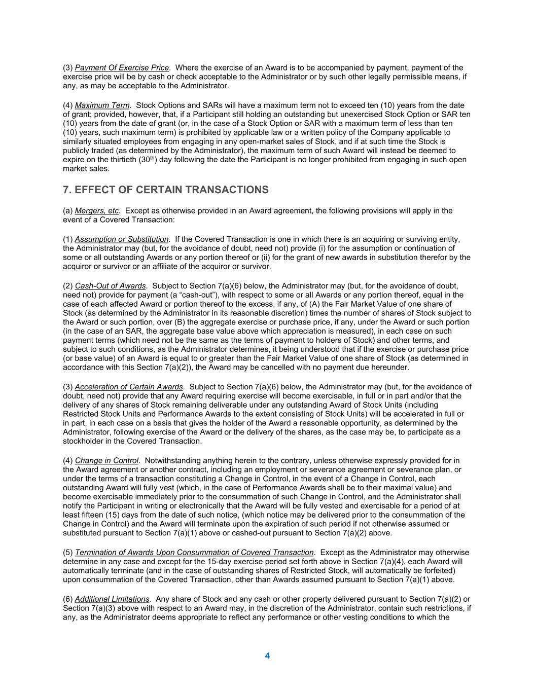 4 (3) Payment Of Exercise Price. Where the exercise of an Award is to be accompanied by payment, payment of the exercise price will be by cash or check acceptable to the Administrator or by such other legally permissible means, if any, as may be acceptable to the Administrator. (4) Maximum Term. Stock Options and SARs will have a maximum term not to exceed ten (10) years from the date of grant; provided, however, that, if a Participant still holding an outstanding but unexercised Stock Option or SAR ten (10) years from the date of grant (or, in the case of a Stock Option or SAR with a maximum term of less than ten (10) years, such maximum term) is prohibited by applicable law or a written policy of the Company applicable to similarly situated employees from engaging in any open-market sales of Stock, and if at such time the Stock is publicly traded (as determined by the Administrator), the maximum term of such Award will instead be deemed to expire on the thirtieth (30th) day following the date the Participant is no longer prohibited from engaging in such open market sales. 7. EFFECT OF CERTAIN TRANSACTIONS (a) Mergers, etc. Except as otherwise provided in an Award agreement, the following provisions will apply in the event of a Covered Transaction: (1) Assumption or Substitution. If the Covered Transaction is one in which there is an acquiring or surviving entity, the Administrator may (but, for the avoidance of doubt, need not) provide (i) for the assumption or continuation of some or all outstanding Awards or any portion thereof or (ii) for the grant of new awards in substitution therefor by the acquiror or survivor or an affiliate of the acquiror or survivor. (2) Cash-Out of Awards. Subject to Section 7(a)(6) below, the Administrator may (but, for the avoidance of doubt, need not) provide for payment (a “cash-out”), with respect to some or all Awards or any portion thereof, equal in the case of each affected Award or portion thereof to the excess, if any, of (A) the Fair Market Value of one share of Stock (as determined by the Administrator in its reasonable discretion) times the number of shares of Stock subject to the Award or such portion, over (B) the aggregate exercise or purchase price, if any, under the Award or such portion (in the case of an SAR, the aggregate base value above which appreciation is measured), in each case on such payment terms (which need not be the same as the terms of payment to holders of Stock) and other terms, and subject to such conditions, as the Administrator determines, it being understood that if the exercise or purchase price (or base value) of an Award is equal to or greater than the Fair Market Value of one share of Stock (as determined in accordance with this Section 7(a)(2)), the Award may be cancelled with no payment due hereunder. (3) Acceleration of Certain Awards. Subject to Section 7(a)(6) below, the Administrator may (but, for the avoidance of doubt, need not) provide that any Award requiring exercise will become exercisable, in full or in part and/or that the delivery of any shares of Stock remaining deliverable under any outstanding Award of Stock Units (including Restricted Stock Units and Performance Awards to the extent consisting of Stock Units) will be accelerated in full or in part, in each case on a basis that gives the holder of the Award a reasonable opportunity, as determined by the Administrator, following exercise of the Award or the delivery of the shares, as the case may be, to participate as a stockholder in the Covered Transaction. (4) Change in Control. Notwithstanding anything herein to the contrary, unless otherwise expressly provided for in the Award agreement or another contract, including an employment or severance agreement or severance plan, or under the terms of a transaction constituting a Change in Control, in the event of a Change in Control, each outstanding Award will fully vest (which, in the case of Performance Awards shall be to their maximal value) and become exercisable immediately prior to the consummation of such Change in Control, and the Administrator shall notify the Participant in writing or electronically that the Award will be fully vested and exercisable for a period of at least fifteen (15) days from the date of such notice, (which notice may be delivered prior to the consummation of the Change in Control) and the Award will terminate upon the expiration of such period if not otherwise assumed or substituted pursuant to Section 7(a)(1) above or cashed-out pursuant to Section 7(a)(2) above. (5) Termination of Awards Upon Consummation of Covered Transaction. Except as the Administrator may otherwise determine in any case and except for the 15-day exercise period set forth above in Section 7(a)(4), each Award will automatically terminate (and in the case of outstanding shares of Restricted Stock, will automatically be forfeited) upon consummation of the Covered Transaction, other than Awards assumed pursuant to Section 7(a)(1) above. (6) Additional Limitations. Any share of Stock and any cash or other property delivered pursuant to Section 7(a)(2) or Section 7(a)(3) above with respect to an Award may, in the discretion of the Administrator, contain such restrictions, if any, as the Administrator deems appropriate to reflect any performance or other vesting conditions to which the