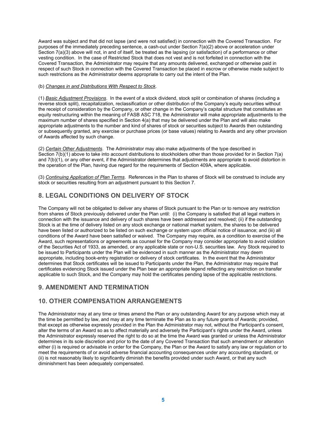 5 Award was subject and that did not lapse (and were not satisfied) in connection with the Covered Transaction. For purposes of the immediately preceding sentence, a cash-out under Section 7(a)(2) above or acceleration under Section 7(a)(3) above will not, in and of itself, be treated as the lapsing (or satisfaction) of a performance or other vesting condition. In the case of Restricted Stock that does not vest and is not forfeited in connection with the Covered Transaction, the Administrator may require that any amounts delivered, exchanged or otherwise paid in respect of such Stock in connection with the Covered Transaction be placed in escrow or otherwise made subject to such restrictions as the Administrator deems appropriate to carry out the intent of the Plan. (b) Changes in and Distributions With Respect to Stock. (1) Basic Adjustment Provisions. In the event of a stock dividend, stock split or combination of shares (including a reverse stock split), recapitalization, reclassification or other distribution of the Company’s equity securities without the receipt of consideration by the Company, or other change in the Company’s capital structure that constitutes an equity restructuring within the meaning of FASB ASC 718, the Administrator will make appropriate adjustments to the maximum number of shares specified in Section 4(a) that may be delivered under the Plan and will also make appropriate adjustments to the number and kind of shares of stock or securities subject to Awards then outstanding or subsequently granted, any exercise or purchase prices (or base values) relating to Awards and any other provision of Awards affected by such change. (2) Certain Other Adjustments. The Administrator may also make adjustments of the type described in Section 7(b)(1) above to take into account distributions to stockholders other than those provided for in Section 7(a) and 7(b)(1), or any other event, if the Administrator determines that adjustments are appropriate to avoid distortion in the operation of the Plan, having due regard for the requirements of Section 409A, where applicable. (3) Continuing Application of Plan Terms. References in the Plan to shares of Stock will be construed to include any stock or securities resulting from an adjustment pursuant to this Section 7. 8. LEGAL CONDITIONS ON DELIVERY OF STOCK The Company will not be obligated to deliver any shares of Stock pursuant to the Plan or to remove any restriction from shares of Stock previously delivered under the Plan until: (i) the Company is satisfied that all legal matters in connection with the issuance and delivery of such shares have been addressed and resolved; (ii) if the outstanding Stock is at the time of delivery listed on any stock exchange or national market system, the shares to be delivered have been listed or authorized to be listed on such exchange or system upon official notice of issuance; and (iii) all conditions of the Award have been satisfied or waived. The Company may require, as a condition to exercise of the Award, such representations or agreements as counsel for the Company may consider appropriate to avoid violation of the Securities Act of 1933, as amended, or any applicable state or non-U.S. securities law. Any Stock required to be issued to Participants under the Plan will be evidenced in such manner as the Administrator may deem appropriate, including book-entry registration or delivery of stock certificates. In the event that the Administrator determines that Stock certificates will be issued to Participants under the Plan, the Administrator may require that certificates evidencing Stock issued under the Plan bear an appropriate legend reflecting any restriction on transfer applicable to such Stock, and the Company may hold the certificates pending lapse of the applicable restrictions. 9. AMENDMENT AND TERMINATION 10. OTHER COMPENSATION ARRANGEMENTS The Administrator may at any time or times amend the Plan or any outstanding Award for any purpose which may at the time be permitted by law, and may at any time terminate the Plan as to any future grants of Awards; provided, that except as otherwise expressly provided in the Plan the Administrator may not, without the Participant’s consent, alter the terms of an Award so as to affect materially and adversely the Participant’s rights under the Award, unless the Administrator expressly reserved the right to do so at the time the Award was granted or unless the Administrator determines in its sole discretion and prior to the date of any Covered Transaction that such amendment or alteration either (i) is required or advisable in order for the Company, the Plan or the Award to satisfy any law or regulation or to meet the requirements of or avoid adverse financial accounting consequences under any accounting standard, or (ii) is not reasonably likely to significantly diminish the benefits provided under such Award, or that any such diminishment has been adequately compensated.
