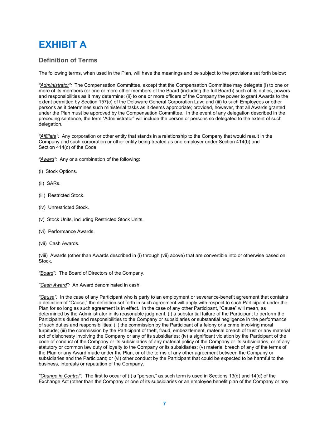 7 EXHIBIT A Definition of Terms The following terms, when used in the Plan, will have the meanings and be subject to the provisions set forth below: “Administrator”: The Compensation Committee, except that the Compensation Committee may delegate (i) to one or more of its members (or one or more other members of the Board (including the full Board)) such of its duties, powers and responsibilities as it may determine; (ii) to one or more officers of the Company the power to grant Awards to the extent permitted by Section 157(c) of the Delaware General Corporation Law; and (iii) to such Employees or other persons as it determines such ministerial tasks as it deems appropriate; provided, however, that all Awards granted under the Plan must be approved by the Compensation Committee. In the event of any delegation described in the preceding sentence, the term “Administrator” will include the person or persons so delegated to the extent of such delegation. “Affiliate”: Any corporation or other entity that stands in a relationship to the Company that would result in the Company and such corporation or other entity being treated as one employer under Section 414(b) and Section 414(c) of the Code. “Award”: Any or a combination of the following: (i) Stock Options. (ii) SARs. (iii) Restricted Stock. (iv) Unrestricted Stock. (v) Stock Units, including Restricted Stock Units. (vi) Performance Awards. (vii) Cash Awards. (viii) Awards (other than Awards described in (i) through (vii) above) that are convertible into or otherwise based on Stock. “Board”: The Board of Directors of the Company. “Cash Award”: An Award denominated in cash. “Cause”: In the case of any Participant who is party to an employment or severance-benefit agreement that contains a definition of “Cause,” the definition set forth in such agreement will apply with respect to such Participant under the Plan for so long as such agreement is in effect. In the case of any other Participant, “Cause” will mean, as determined by the Administrator in its reasonable judgment, (i) a substantial failure of the Participant to perform the Participant’s duties and responsibilities to the Company or subsidiaries or substantial negligence in the performance of such duties and responsibilities; (ii) the commission by the Participant of a felony or a crime involving moral turpitude; (iii) the commission by the Participant of theft, fraud, embezzlement, material breach of trust or any material act of dishonesty involving the Company or any of its subsidiaries; (iv) a significant violation by the Participant of the code of conduct of the Company or its subsidiaries of any material policy of the Company or its subsidiaries, or of any statutory or common law duty of loyalty to the Company or its subsidiaries; (v) material breach of any of the terms of the Plan or any Award made under the Plan, or of the terms of any other agreement between the Company or subsidiaries and the Participant; or (vi) other conduct by the Participant that could be expected to be harmful to the business, interests or reputation of the Company. “Change in Control”: The first to occur of (i) a “person,” as such term is used in Sections 13(d) and 14(d) of the Exchange Act (other than the Company or one of its subsidiaries or an employee benefit plan of the Company or any