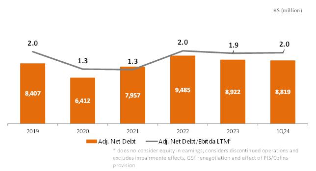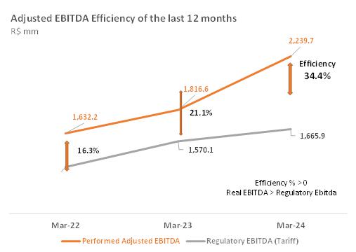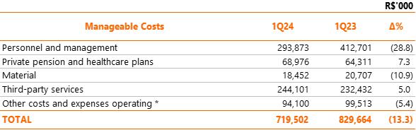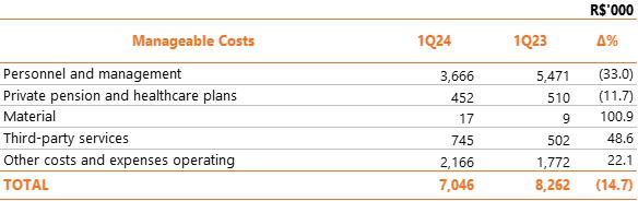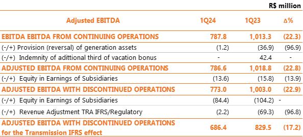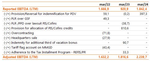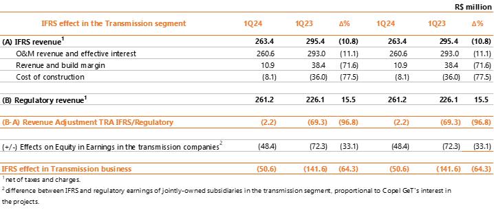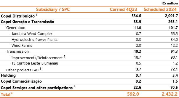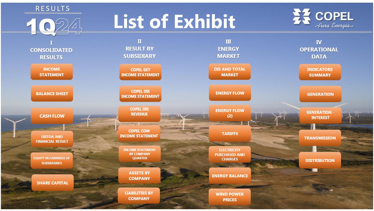 | 1 Proportional to Copel's interest in the project. Values referring to the 2023/2024 cycle, effective from July 1, 2023, according to REH 3.216/2023 - Technical Note No. 39/2023 – STR/ANEEL, of December 30, 2023. Considers investments that came into operation until 03/31/2024. ² Considers double circuit sections (circuits that share the same transmission tower). ³ Contract renewed according to Law 12,783/13. The O&M portion is part of the RBSE, under the terms of the Law. It will be received until the end of the concession (Jan/2043). The value of the APR for the 2023-2024 cycle, excluding the RBSE, according to REH 3,216/2023, is R$ 146.1 million. This amount refers to additional RAP for reinforcements and improvements, in effect when REH 3,216/2023 was published. 4 As of 10.31.2018, the APR was reduced by 50%. 5 The construction of 38 km of sectioning lines was foreseen in the implementation of the Andirá Leste and Medianeira SEs, 2 km of which for Contract 060/2001 and 36 km for LTs that do not belong to Copel GeT, which, despite being included in the APR, in reason for the investment made, will not be added to Copel's assets. 6 As of 07/09/2021, the APR was reduced by 50%. 7 Consolidated Result. 8 Equity Income. | |||||||