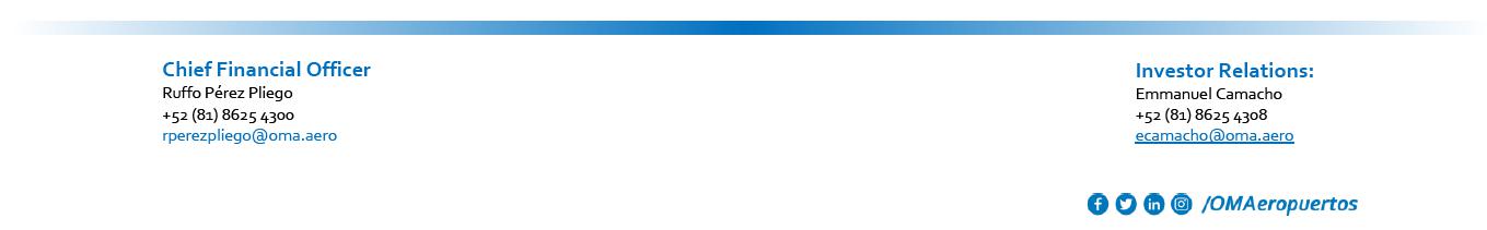 Grupo Aeroportuario del Centro Norte, S.A.B. de C.V., known as OMA, operates 13 international airports in nine states of central and northern Mexico. OMA’s airports serve Monterrey, Mexico’s third largest metropolitan area, the tourist destinations of Acapulco, Mazatlán, and Zihuatanejo, and nine other regional centers and border cities. OMA also operates the NH Collection Hotel inside Terminal 2 of the Mexico City airport and the Hilton Garden Inn at the Monterrey airport. OMA employs over 1,200 persons in order to offer passengers and clients airport and commercial services in facilities that comply with all applicable international safety, and security. OMA is listed on the Mexican Stock Exchange (OMA) and on the NASDAQ Global Select Market (OMAB). For more information, visit: