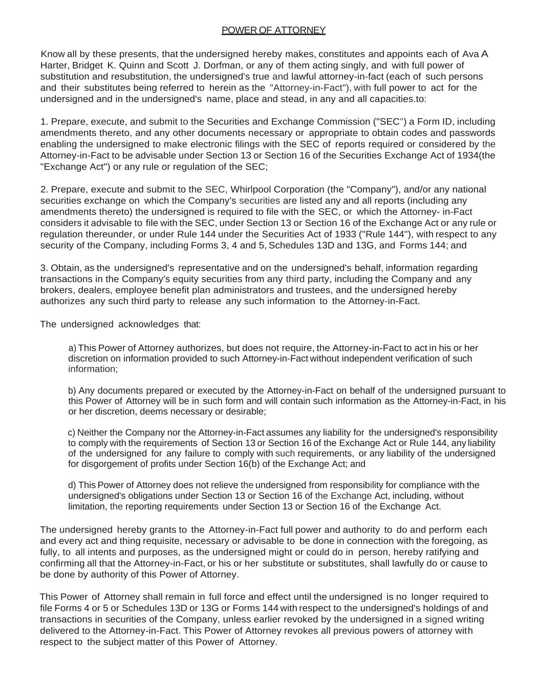 POWER OF ATTORNEY Know all by these presents, that the undersigned hereby makes, constitutes and appoints each of Ava A Harter, Bridget K. Quinn and Scott J. Dorfman, or any of them acting singly, and with full power of substitution and resubstitution, the undersigned's true and lawful attorney-in-fact (each of such persons and their substitutes being referred to herein as the "Attorney-in-Fact"), with full power to act for the undersigned and in the undersigned's name, place and stead, in any and all capacities.to: 1. Prepare, execute, and submit to the Securities and Exchange Commission ("SEC") a Form ID, including amendments thereto, and any other documents necessary or appropriate to obtain codes and passwords enabling the undersigned to make electronic filings with the SEC of reports required or considered by the Attorney-in-Fact to be advisable under Section 13 or Section 16 of the Securities Exchange Act of 1934(the "Exchange Act") or any rule or regulation of the SEC; 2. Prepare, execute and submit to the SEC, Whirlpool Corporation (the "Company"), and/or any national securities exchange on which the Company's securities are listed any and all reports (including any amendments thereto) the undersigned is required to file with the SEC, or which the Attorney- in-Fact considers it advisable to file with the SEC, under Section 13 or Section 16 of the Exchange Act or any rule or regulation thereunder, or under Rule 144 under the Securities Act of 1933 ("Rule 144"), with respect to any security of the Company, including Forms 3, 4 and 5, Schedules 13D and 13G, and Forms 144; and 3. Obtain, as the undersigned's representative and on the undersigned's behalf, information regarding transactions in the Company's equity securities from any third party, including the Company and any brokers, dealers, employee benefit plan administrators and trustees, and the undersigned hereby authorizes any such third party to release any such information to the Attorney-in-Fact. The undersigned acknowledges that: a) This Power of Attorney authorizes, but does not require, the Attorney-in-Fact to act in his or her discretion on information provided to such Attorney-in-Fact without independent verification of such information; b) Any documents prepared or executed by the Attorney-in-Fact on behalf of the undersigned pursuant to this Power of Attorney will be in such form and will contain such information as the Attorney-in-Fact, in his or her discretion, deems necessary or desirable; c) Neither the Company nor the Attorney-in-Fact assumes any liability for the undersigned's responsibility to comply with the requirements of Section 13 or Section 16 of the Exchange Act or Rule 144, any liability of the undersigned for any failure to comply with such requirements, or any liability of the undersigned for disgorgement of profits under Section 16(b) of the Exchange Act; and d) This Power of Attorney does not relieve the undersigned from responsibility for compliance with the undersigned's obligations under Section 13 or Section 16 of the Exchange Act, including, without limitation, the reporting requirements under Section 13 or Section 16 of the Exchange Act. The undersigned hereby grants to the Attorney-in-Fact full power and authority to do and perform each and every act and thing requisite, necessary or advisable to be done in connection with the foregoing, as fully, to all intents and purposes, as the undersigned might or could do in person, hereby ratifying and confirming all that the Attorney-in-Fact, or his or her substitute or substitutes, shall lawfully do or cause to be done by authority of this Power of Attorney. This Power of Attorney shall remain in full force and effect until the undersigned is no longer required to file Forms 4 or 5 or Schedules 13D or 13G or Forms 144 with respect to the undersigned's holdings of and transactions in securities of the Company, unless earlier revoked by the undersigned in a signed writing delivered to the Attorney-in-Fact. This Power of Attorney revokes all previous powers of attorney with respect to the subject matter of this Power of Attorney.