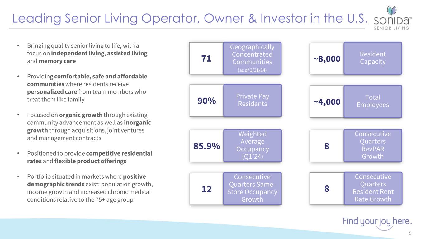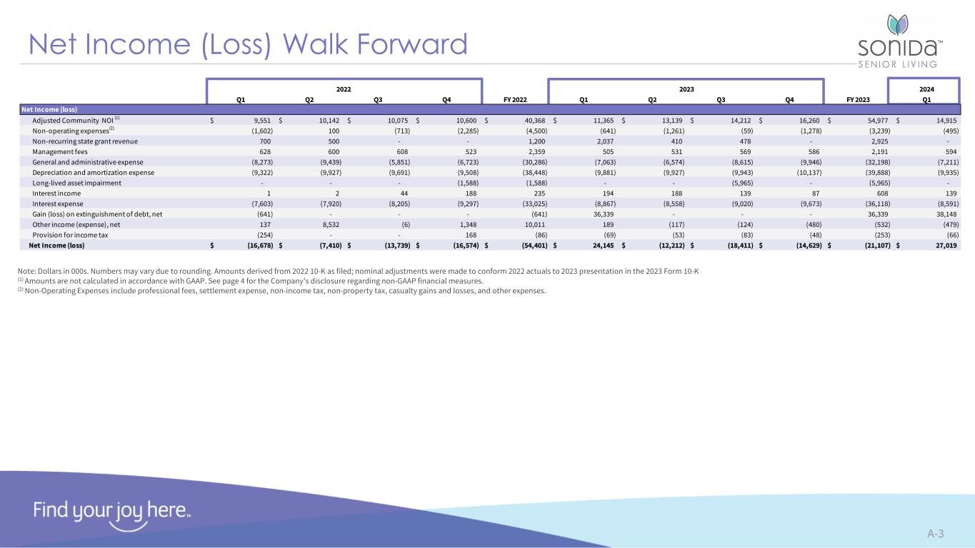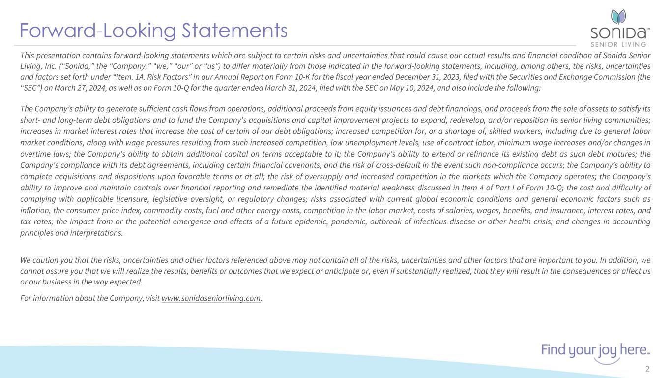 Forward-Looking Statements 2 This presentation contains forward-looking statements which are subject to certain risks and uncertainties that could cause our actual results and financial condition of Sonida Senior Living, Inc. (“Sonida,” the “Company,” “we,” “our” or “us”) to differ materially from those indicated in the forward-looking statements, including, among others, the risks, uncertainties and factors set forth under “Item. 1A. Risk Factors” in our Annual Report on Form 10-K for the fiscal year ended December 31, 2023, filed with the Securities and Exchange Commission (the “SEC”) on March 27, 2024, as well as on Form 10-Q for the quarter ended March 31, 2024, filed with the SEC on May 10, 2024, and also include the following: The Company’s ability to generate sufficient cash flows from operations, additional proceeds from equity issuances and debt financings, and proceeds from the sale of assets to satisfy its short- and long-term debt obligations and to fund the Company’s acquisitions and capital improvement projects to expand, redevelop, and/or reposition its senior living communities; increases in market interest rates that increase the cost of certain of our debt obligations; increased competition for, or a shortage of, skilled workers, including due to general labor market conditions, along with wage pressures resulting from such increased competition, low unemployment levels, use of contract labor, minimum wage increases and/or changes in overtime laws; the Company’s ability to obtain additional capital on terms acceptable to it; the Company’s ability to extend or refinance its existing debt as such debt matures; the Company’s compliance with its debt agreements, including certain financial covenants, and the risk of cross-default in the event such non-compliance occurs; the Company’s ability to complete acquisitions and dispositions upon favorable terms or at all; the risk of oversupply and increased competition in the markets which the Company operates; the Company’s ability to improve and maintain controls over financial reporting and remediate the identified material weakness discussed in Item 4 of Part I of Form 10-Q; the cost and difficulty of complying with applicable licensure, legislative oversight, or regulatory changes; risks associated with current global economic conditions and general economic factors such as inflation, the consumer price index, commodity costs, fuel and other energy costs, competition in the labor market, costs of salaries, wages, benefits, and insurance, interest rates, and tax rates; the impact from or the potential emergence and effects of a future epidemic, pandemic, outbreak of infectious disease or other health crisis; and changes in accounting principles and interpretations. We caution you that the risks, uncertainties and other factors referenced above may not contain all of the risks, uncertainties and other factors that are important to you. In addition, we cannot assure you that we will realize the results, benefits or outcomes that we expect or anticipate or, even if substantially realized, that they will result in the consequences or affect us or our business in the way expected. For information about the Company, visit www.sonidaseniorliving.com.
