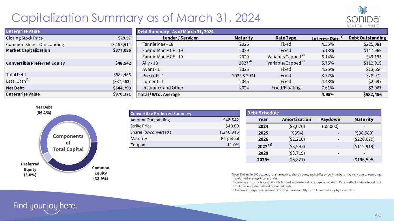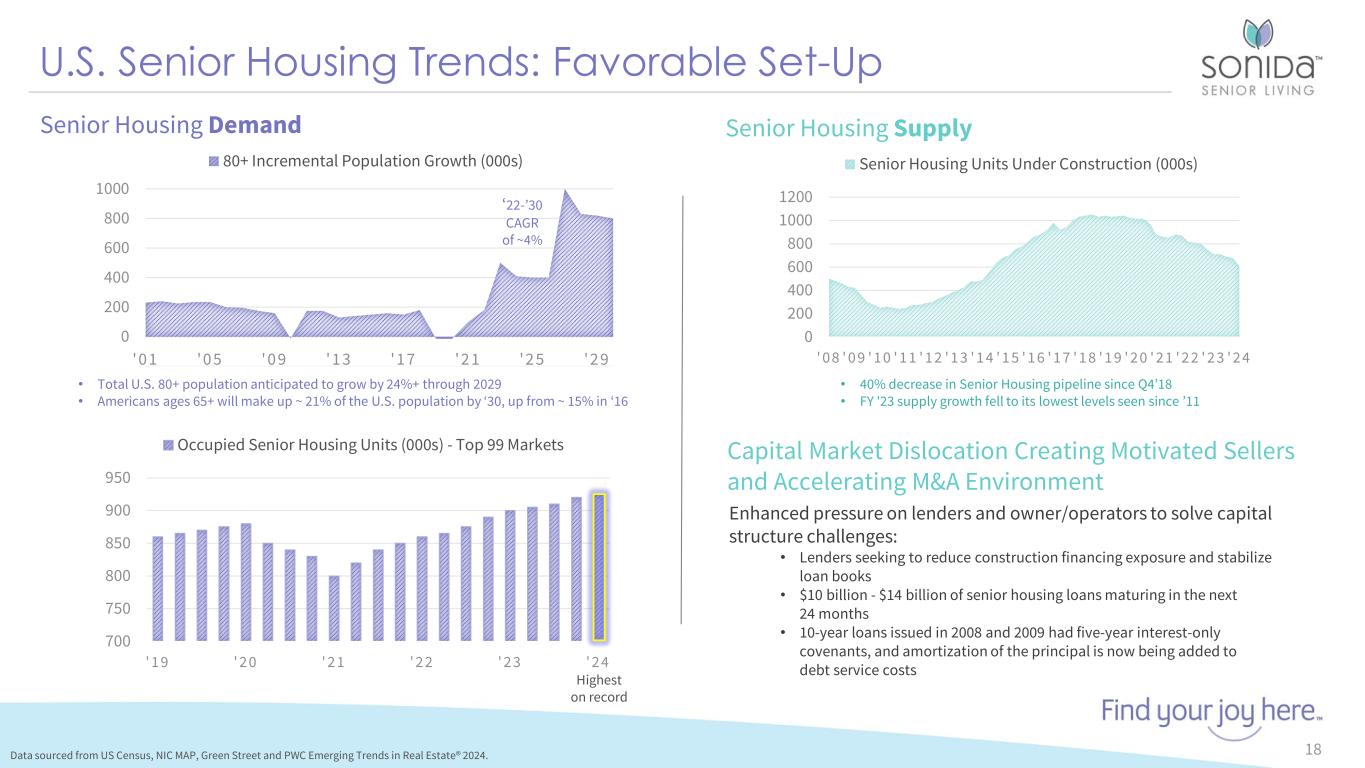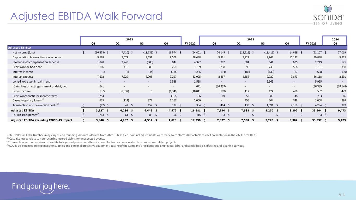 Forward-Looking Statements 2 This presentation contains forward-looking statements which are subject to certain risks and uncertainties that could cause our actual results and financial condition of Sonida Senior Living, Inc. (“Sonida,” the “Company,” “we,” “our” or “us”) to differ materially from those indicated in the forward-looking statements, including, among others, the risks, uncertainties and factors set forth under “Item. 1A. Risk Factors” in our Annual Report on Form 10-K for the fiscal year ended December 31, 2023, filed with the Securities and Exchange Commission (the “SEC”) on March 27, 2024, as well as on Form 10-Q for the quarter ended March 31, 2024, filed with the SEC on May 10, 2024, and also include the following: The Company’s ability to generate sufficient cash flows from operations, additional proceeds from equity issuances and debt financings, and proceeds from the sale of assets to satisfy its short- and long-term debt obligations and to fund the Company’s acquisitions and capital improvement projects to expand, redevelop, and/or reposition its senior living communities; increases in market interest rates that increase the cost of certain of our debt obligations; increased competition for, or a shortage of, skilled workers, including due to general labor market conditions, along with wage pressures resulting from such increased competition, low unemployment levels, use of contract labor, minimum wage increases and/or changes in overtime laws; the Company’s ability to obtain additional capital on terms acceptable to it; the Company’s ability to extend or refinance its existing debt as such debt matures; the Company’s compliance with its debt agreements, including certain financial covenants, and the risk of cross-default in the event such non-compliance occurs; the Company’s ability to complete acquisitions and dispositions upon favorable terms or at all; the risk of oversupply and increased competition in the markets which the Company operates; the Company’s ability to improve and maintain controls over financial reporting and remediate the identified material weakness discussed in Item 4 of Part I of Form 10-Q; the cost and difficulty of complying with applicable licensure, legislative oversight, or regulatory changes; risks associated with current global economic conditions and general economic factors such as inflation, the consumer price index, commodity costs, fuel and other energy costs, competition in the labor market, costs of salaries, wages, benefits, and insurance, interest rates, and tax rates; the impact from or the potential emergence and effects of a future epidemic, pandemic, outbreak of infectious disease or other health crisis; and changes in accounting principles and interpretations. We caution you that the risks, uncertainties and other factors referenced above may not contain all of the risks, uncertainties and other factors that are important to you. In addition, we cannot assure you that we will realize the results, benefits or outcomes that we expect or anticipate or, even if substantially realized, that they will result in the consequences or affect us or our business in the way expected. For information about the Company, visit www.sonidaseniorliving.com.