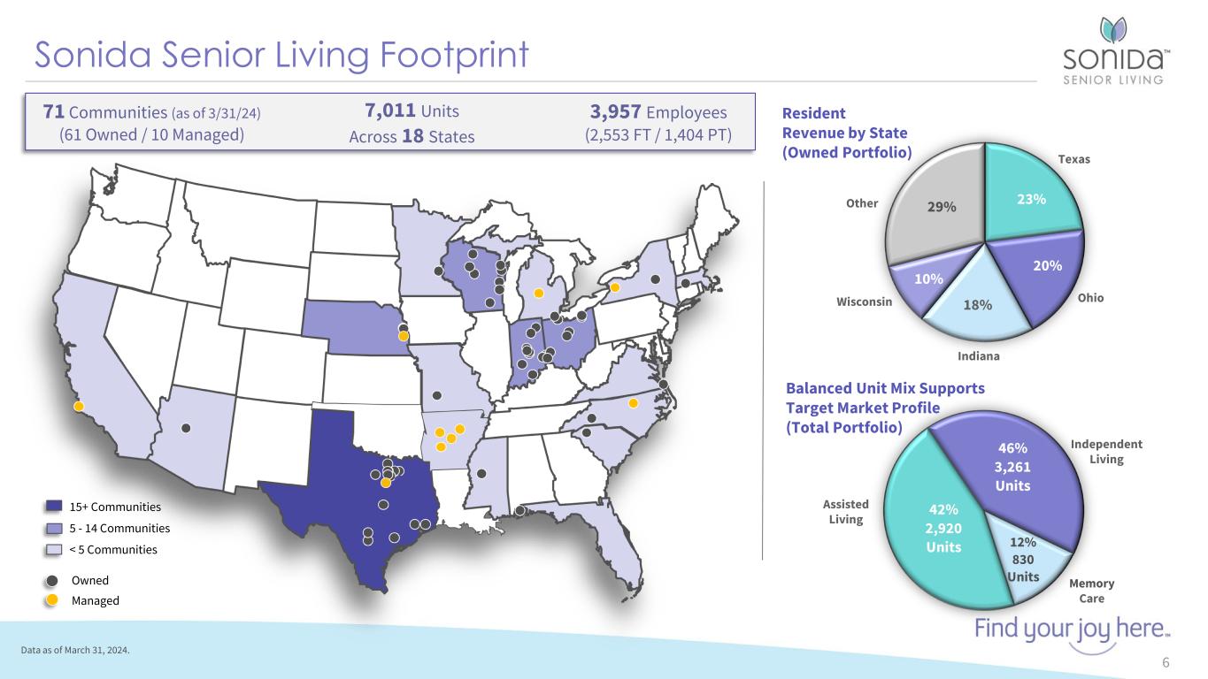Leading Senior Living Operator, Owner & Investor in the U.S. 5 • Bringing quality senior living to life, with a focus on independent living, assisted living and memory care • Providing comfortable, safe and affordable communities where residents receive personalized care from team members who treat them like family • Focused on organic growth through existing community advancement as well as inorganic growth through acquisitions, joint ventures and management contracts • Positioned to provide competitive residential rates and flexible product offerings • Portfolio situated in markets where positive demographic trends exist: population growth, income growth and increased chronic medical conditions relative to the 75+ age group 8 XX XX XX 8 Consecutive Qtr Revenue Growth 12 Consecutive Qtr Occupancy Growth 90% Private Pay Residents ~4,000 Total Employees 85.9% Weighted Avg Occupancy (Q1) ~8,000 Resident Capacity71 Geographically Concentrated Communities Geographically Concentrated Communities (as of 3/31/24) Weighted Average Occupancy (Q1’24) Private Pay Residents Consecutive Quarters Same- Store Occupancy t Consecutive Quarters Resident Rent Rate Growth Consecutive Quarters RevPAR Gr l Employees R t Capacity