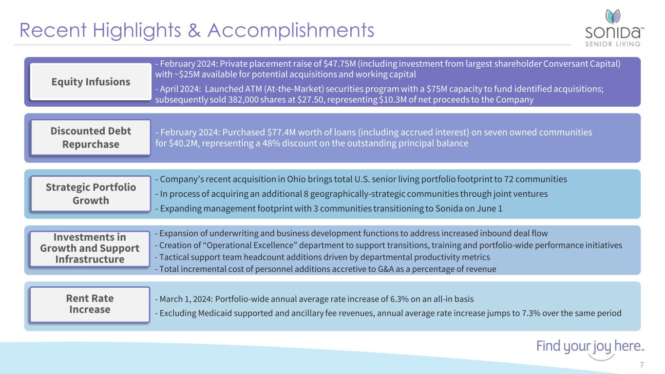 3,957 Employees (2,553 FT / 1,404 PT) Sonida Senior Living Footprint 6 71 Communities (as of 3/31/24) (61 Owned / 10 Managed) 15+ Communities 5 - 14 Communities < 5 Communities 7,011 Units Across 18 States Managed Owned Data as of March 31, 2024. 23% 20% 18% 10% 29% Texas OhioWisconsin Indiana Other Resident Revenue by State (Owned Portfolio) 46% 3,261 Units 42% 2,920 Units 12% 830 Units Assisted Living Memory Care Independent Living Balanced Unit Mix Supports Target Market Profile (Total Portfolio)