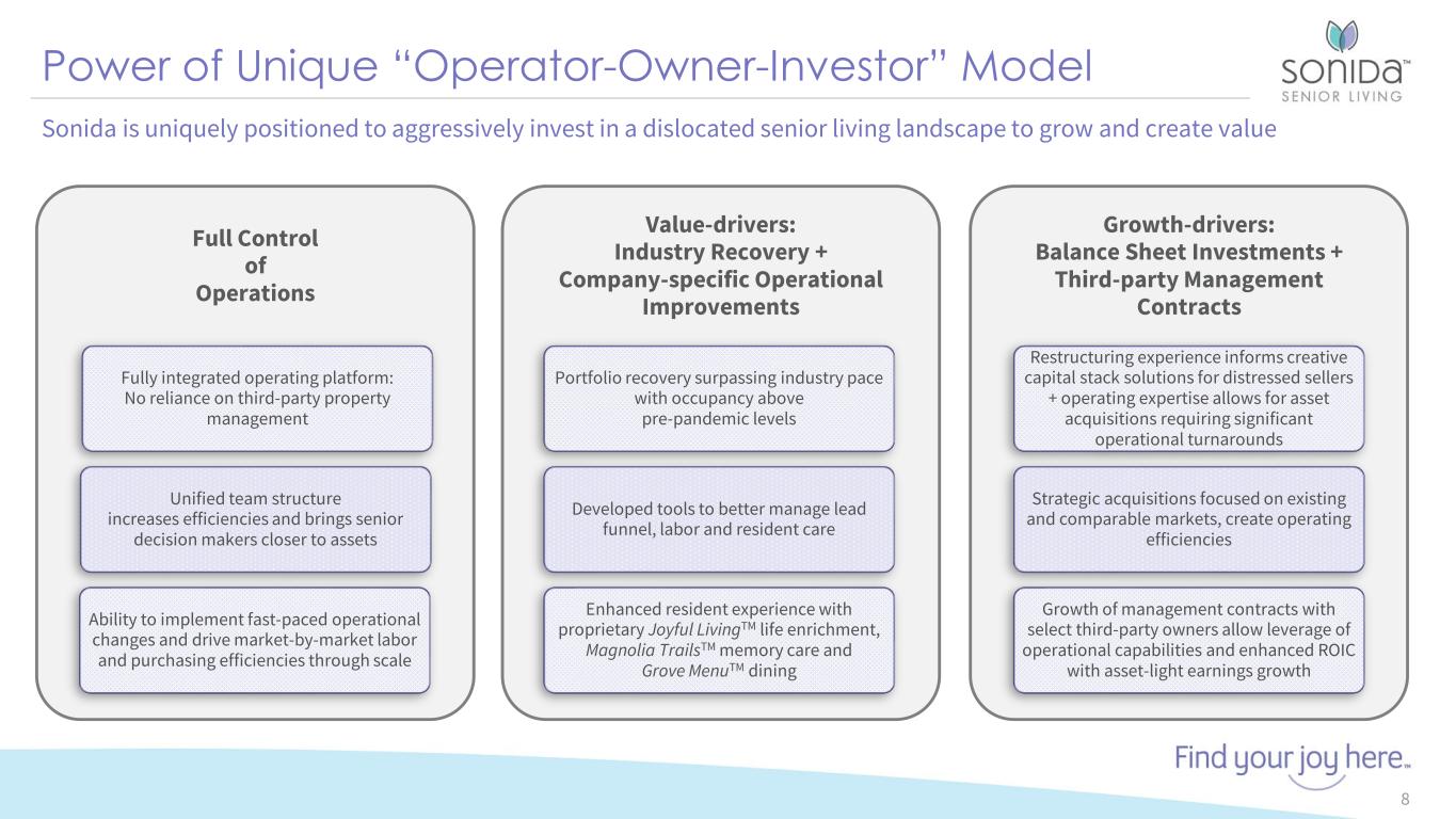Power of Unique “Operator-Owner-Investor” Model 8 Full Control of Operations Fully integrated operating platform: No reliance on third-party property management Unified team structure increases efficiencies and brings senior decision makers closer to assets Ability to implement fast-paced operational changes and drive market-by-market labor and purchasing efficiencies through scale Value-drivers: Industry Recovery + Company-specific Operational Improvements Portfolio recovery surpassing industry pace with occupancy above pre-pandemic levels Developed tools to better manage lead funnel, labor and resident care Enhanced resident experience with proprietary Joyful LivingTM life enrichment, Magnolia TrailsTM memory care and Grove MenuTM dining Growth-drivers: Balance Sheet Investments + Third-party Management Contracts Restructuring experience informs creative capital stack solutions for distressed sellers + operating expertise allows for asset acquisitions requiring significant operational turnarounds Strategic acquisitions focused on existing and comparable markets, create operating efficiencies Growth of management contracts with select third-party owners allow leverage of operational capabilities and enhanced ROIC with asset-light earnings growth Sonida is uniquely positioned to aggressively invest in a dislocated senior living landscape to grow and create value
