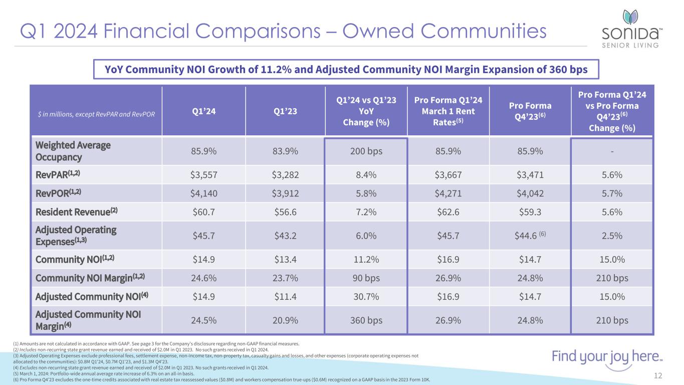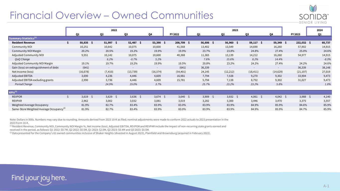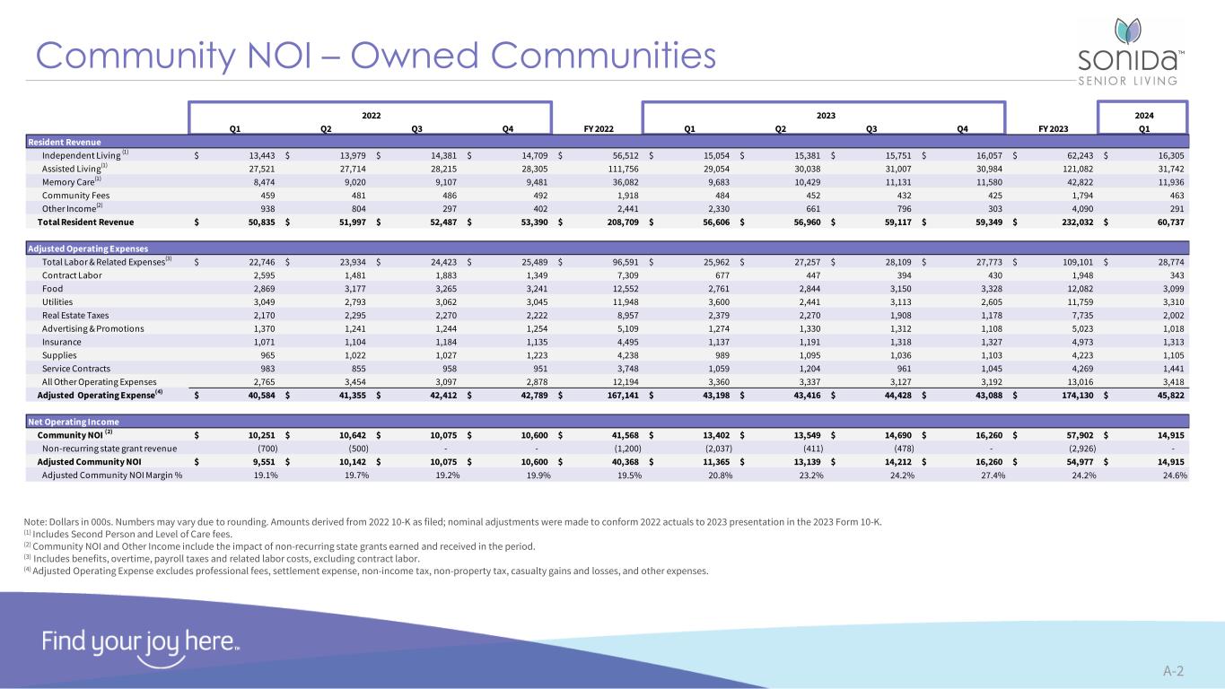 (3) Includes $2.0 million of state grant revenue received in Q1 2023. There were no such grant revenues in Q1 2024 or Q4 2023. Excluding the grant revenue, Q1 2023 consolidated community NOI margin was 20.8%.