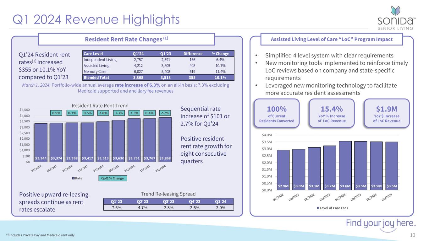 •Resident revenue increased $4.1 million, or 7.3%, comparing Q1 2024 to Q1 2023.
