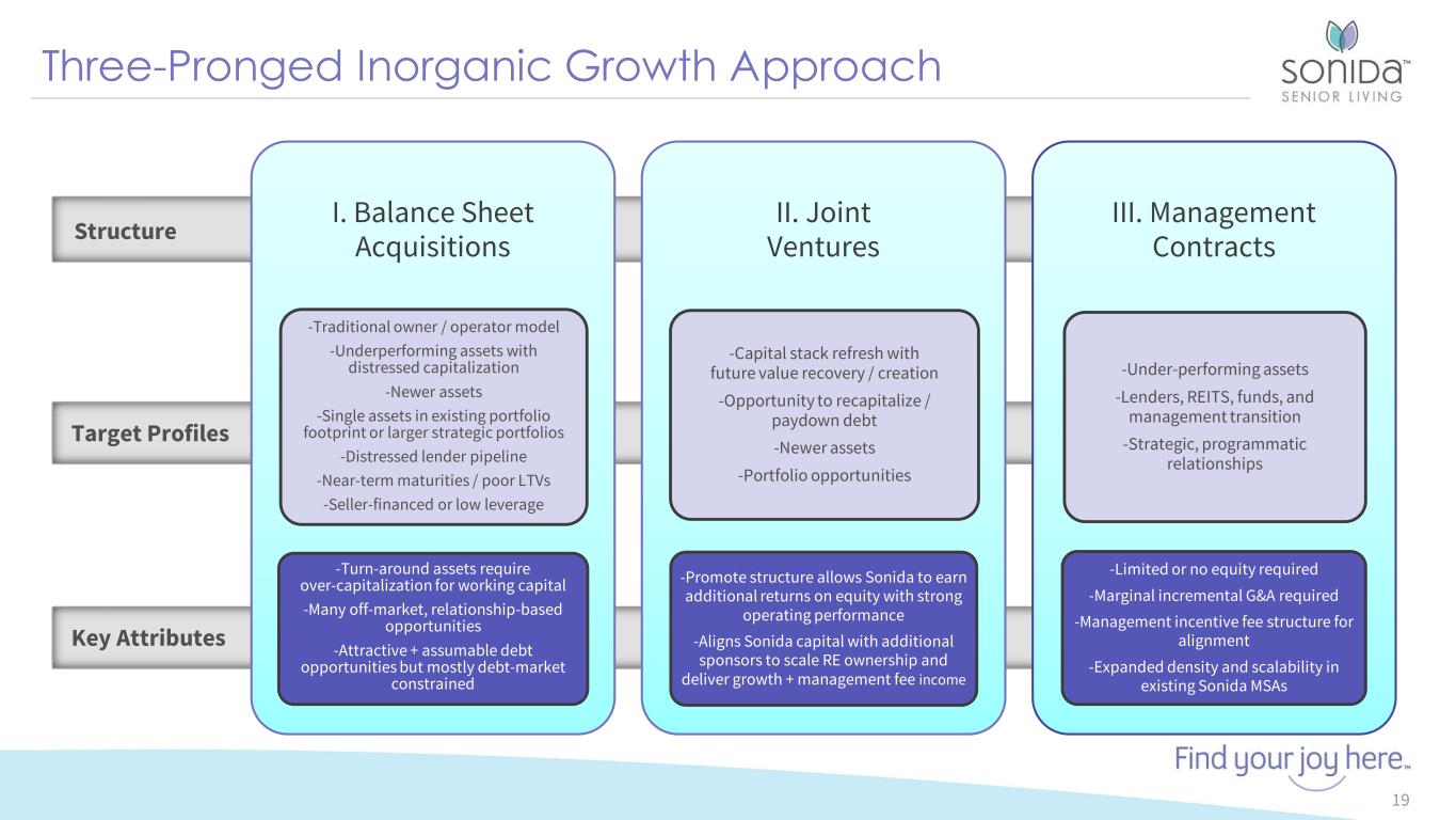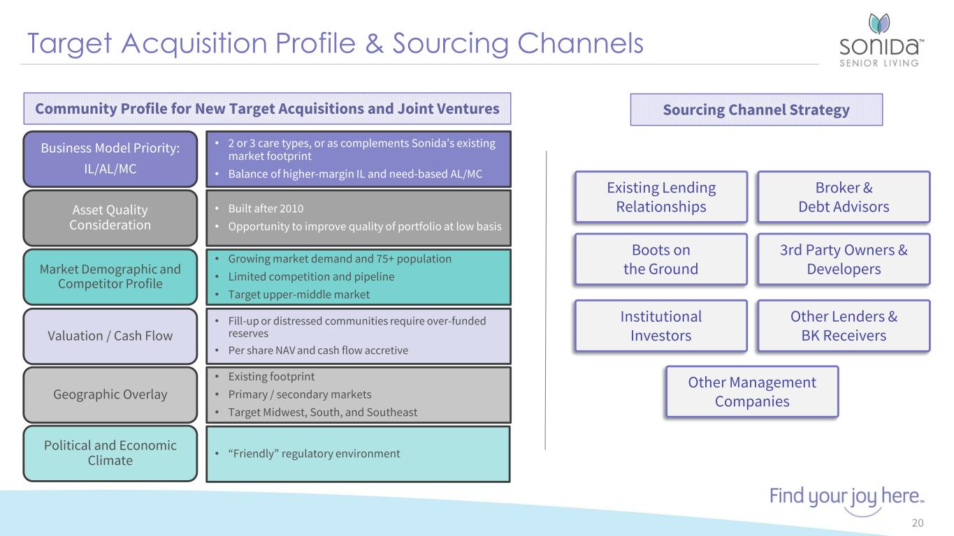 Three-Pronged Inorganic Growth Approach 19 Target Profiles Key Attributes I. Balance Sheet Acquisitions -Traditional owner / operator model -Underperforming assets with distressed capitalization -Newer assets -Single assets in existing portfolio footprint or larger strategic portfolios -Distressed lender pipeline -Near-term maturities / poor LTVs -Seller-financed or low leverage -Turn-around assets require over-capitalization for working capital -Many off-market, relationship-based opportunities -Attractive + assumable debt opportunities but mostly debt-market constrained II. Joint Ventures -Capital stack refresh with future value recovery / creation -Opportunity to recapitalize / paydown debt -Newer assets -Portfolio opportunities -Promote structure allows Sonida to earn additional returns on equity with strong operating performance -Aligns Sonida capital with additional sponsors to scale RE ownership and deliver growth + management fee income III. Management Contracts -Under-performing assets -Lenders, REITS, funds, and management transition -Strategic, programmatic relationships -Limited or no equity required -Marginal incremental G&A required -Management incentive fee structure for alignment -Expanded density and scalability in existing Sonida MSAs Structure