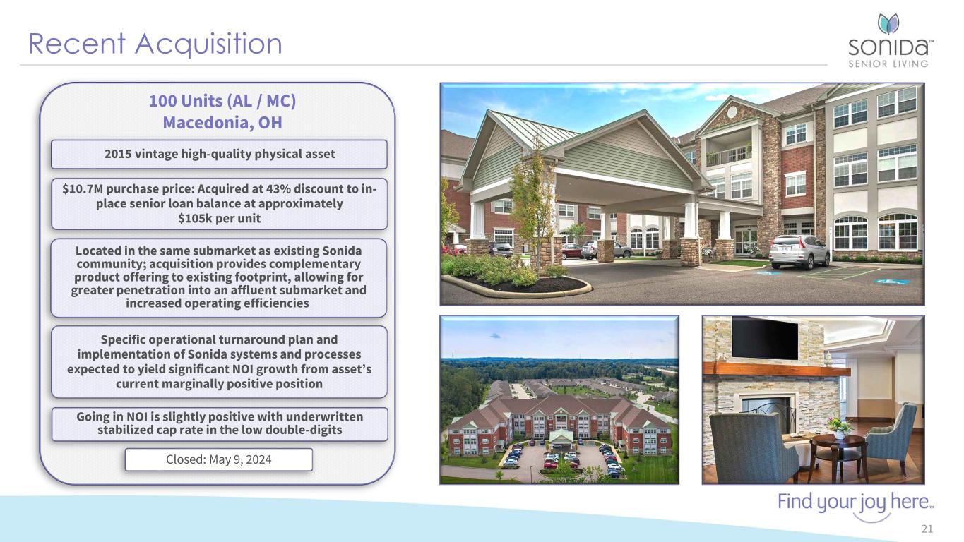 Target Acquisition Profile & Sourcing Channels 20 Community Profile for New Target Acquisitions and Joint Ventures Sourcing Channel Strategy Business Model Priority: IL/AL/MC Asset Quality Consideration Market Demographic and Competitor Profile Valuation / Cash Flow Geographic Overlay Political and Economic Climate • 2 or 3 care types, or as complements Sonida’s existing market footprint • Balance of higher-margin IL and need-based AL/MC • Growing market demand and 75+ population • Limited competition and pipeline • Target upper-middle market • Fill-up or distressed communities require over-funded reserves • Per share NAV and cash flow accretive • Existing footprint • Primary / secondary markets • Target Midwest, South, and Southeast • “Friendly” regulatory environment • Built after 2010 • Opportunity to improve quality of portfolio at low basis Other Lenders & BK Receivers Institutional Investors 3rd Party Owners & Developers Boots on the Ground Broker & Debt Advisors Existing Lending Relationships Other Management Companies