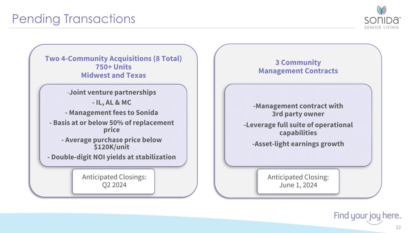 Pending Transactions 22 Two 4-Community Acquisitions (8 Total) 750+ Units Midwest and Texas 3 Community Management Contracts -Joint venture partnerships - IL, AL & MC - Management fees to Sonida - Basis at or below 50% of replacement price - Average purchase price below $120K/unit - Double-digit NOI yields at stabilization Anticipated Closings: Q2 2024 -Management contract with 3rd party owner -Leverage full suite of operational capabilities -Asset-light earnings growth Anticipated Closing: June 1, 2024