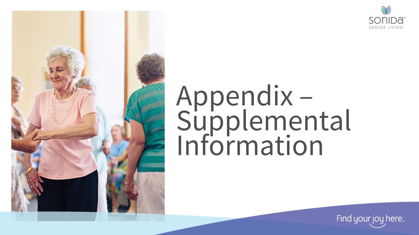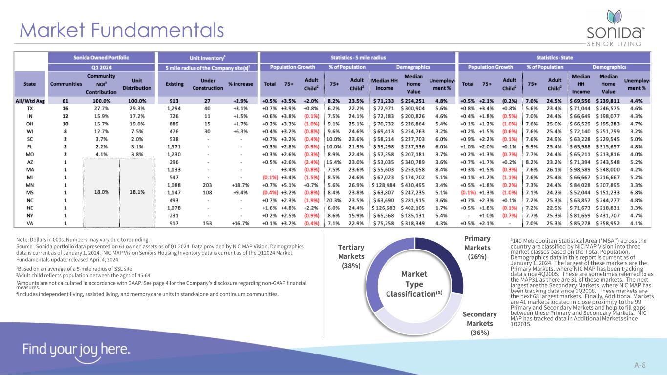 Market Fundamentals A-8 1Based on an average of a 5-mile radius of SSL site 2Adult child reflects population between the ages of 45-64. 3Amounts are not calculated in accordance with GAAP. See page 4 for the Company’s disclosure regarding non-GAAP financial measures. 4Includes independent living, assisted living, and memory care units in stand-alone and continuum communities. Primary Markets (26%) Secondary Markets (36%) Tertiary Markets (38%) Market Type Classification(5) Note: Dollars in 000s. Numbers may vary due to rounding. Source: Sonida portfolio data presented on 61 owned assets as of Q1 2024. Data provided by NIC MAP Vision. Demographics data is current as of January 1, 2024. NIC MAP Vision Seniors Housing Inventory data is current as of the Q12024 Market Fundamentals update released April 4, 2024. 5140 Metropolitan Statistical Area ("MSA") across the country are classified by NIC MAP Vision into three market classes based on the Total Population. Demographics data in this report is current as of January 1, 2024. The largest of these markets are the Primary Markets, where NIC MAP has been tracking data since 4Q2005. These are sometimes referred to as the MAP31 as there are 31 of these markets. The next largest are the Secondary Markets, where NIC MAP has been tracking data since 1Q2008. These markets are the next 68 largest markets. Finally, Additional Markets are 41 markets located in close proximity to the 99 Primary and Secondary Markets and help to fill gaps between these Primary and Secondary Markets. NIC MAP has tracked data in Additional Markets since 1Q2015.
