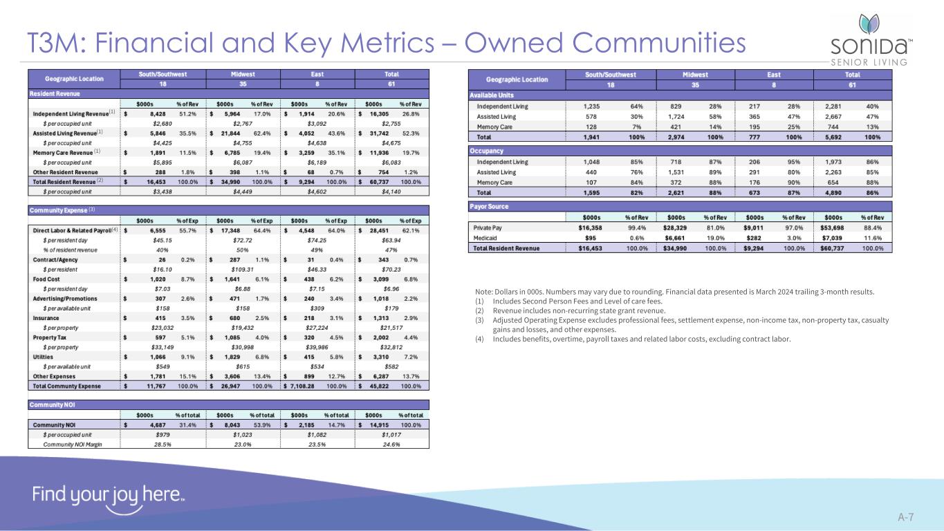 The Company believes that presentation of Community Net Operating Income, Community Net Operating Income Margin, Adjusted Community Net Operating Income, and Adjusted Community Net Operating Income Margin as performance measures are useful to investors because (i) they are one of the metrics used by the Company’s management to evaluate the performance of our core consolidated owed portfolio of communities, to review the Company’s comparable historic and prospective core operating performance of the consolidated owned communities, and to make day-to-day operating decisions; (ii) they provide an assessment of operational factors that management can impact in the short-term, namely revenues and the controllable cost structure of the organization, by eliminating items related to the Company’s financing and capital structure and other items that management does not consider as part of the Company’s underlying core operating performance, and impacts the comparability of performance between periods.
