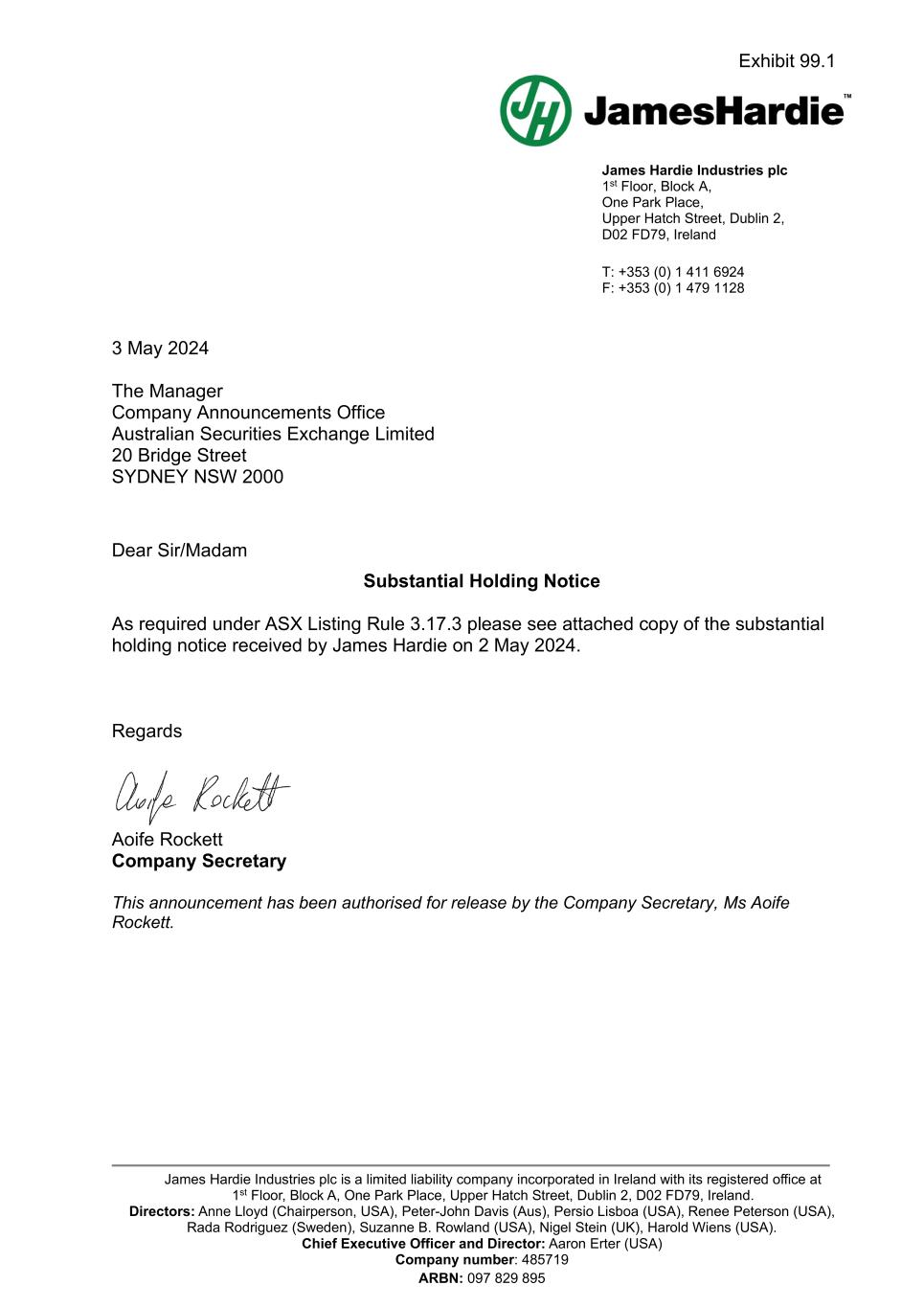Forward-looking statements are based on the Company’s current expectations, estimates and assumptions and because forward-looking statements address future results, events and conditions, they, by their very nature, involve inherent risks and uncertainties, many of which are unforeseeable and beyond the Company’s control. Such known and unknown risks, uncertainties and other factors may cause actual results, performance or other achievements to differ materially from the anticipated results, performance or achievements expressed, projected or implied by these forward-looking statements. These factors, some of which are discussed under “Risk Factors” in Section 3 of the Form 20-F filed with the Securities and Exchange Commission on 16 May 2023, include, but are not limited to: all matters relating to or arising out of the prior manufacture of products that contained asbestos by current and former Company subsidiaries; required contributions to AICF, any shortfall in AICF funding and the effect of currency exchange rate movements on the amount recorded in the Company’s financial statements as an asbestos liability; compliance with and changes in tax laws and treatments; competition and product pricing in the markets in which the Company operates; the consequences of product failures or defects; exposure to environmental, asbestos, putative consumer class action or other legal proceedings; general economic and market conditions; the supply and cost of raw materials; possible increases in competition and the potential that competitors could copy the Company’s products; compliance with and changes in environmental and health and safety laws; risks of conducting business internationally; compliance with and changes in laws and regulations; currency exchange risks; dependence on customer preference and the concentration of the Company’s customer base; dependence on residential and commercial construction markets; the effect of adverse changes in climate or weather patterns; use of accounting estimates; and all other risks identified in the Company’s reports filed with Australian, Irish and US securities regulatory agencies and exchanges (as appropriate). The Company cautions you that the foregoing list of factors is not exhaustive and that other risks and uncertainties may cause actual results to differ materially from those referenced in the Company’s forward-looking statements. Forward-looking statements speak only as of the date they are made and are statements of the Company’s current expectations concerning future results, events and conditions. The Company assumes no obligation to update any forward-looking statements or information except as required by law.
