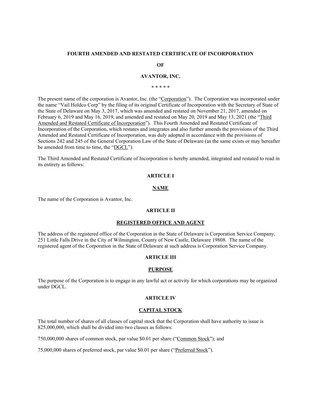 FOURTH AMENDED AND RESTATED CERTIFICATE OF INCORPORATION OF AVANTOR, INC. * * * * * The present name of the corporation is Avantor, Inc. (the “Corporation”). The Corporation was incorporated under the name “Vail Holdco Corp” by the filing of its original Certificate of Incorporation with the Secretary of State of the State of Delaware on May 3, 2017, which was amended and restated on November 21, 2017, amended on February 6, 2019 and May 16, 2019, and amended and restated on May 20, 2019 and May 13, 2021 (the “Third Amended and Restated Certificate of Incorporation”). This Fourth Amended and Restated Certificate of Incorporation of the Corporation, which restates and integrates and also further amends the provisions of the Third Amended and Restated Certificate of Incorporation, was duly adopted in accordance with the provisions of Sections 242 and 245 of the General Corporation Law of the State of Delaware (as the same exists or may hereafter be amended from time to time, the “DGCL”). The Third Amended and Restated Certificate of Incorporation is hereby amended, integrated and restated to read in its entirety as follows: ARTICLE I NAME The name of the Corporation is Avantor, Inc. ARTICLE II REGISTERED OFFICE AND AGENT The address of the registered office of the Corporation in the State of Delaware is Corporation Service Company, 251 Little Falls Drive in the City of Wilmington, County of New Castle, Delaware 19808. The name of the registered agent of the Corporation in the State of Delaware at such address is Corporation Service Company. ARTICLE III PURPOSE The purpose of the Corporation is to engage in any lawful act or activity for which corporations may be organized under DGCL. ARTICLE IV CAPITAL STOCK The total number of shares of all classes of capital stock that the Corporation shall have authority to issue is 825,000,000, which shall be divided into two classes as follows: 750,000,000 shares of common stock, par value $0.01 per share (“Common Stock”); and 75,000,000 shares of preferred stock, par value $0.01 per share (“Preferred Stock”).